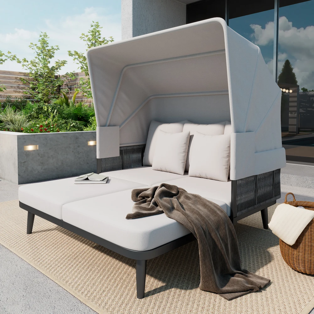 Sad nábytek pro 2se osob, pláž koš, slunce lehátko, zatažitelný markýza, pozinkované ocel formulovat, podhlavník, hand-woven lano