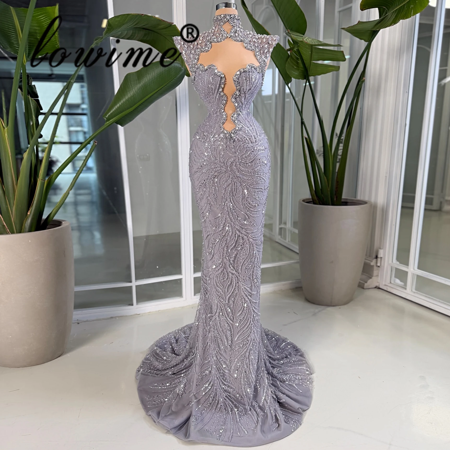 Vynikající vysoký krk mořská panna soumrak šaty šedá bez rukávů ples šaty luxusní broušené sklo korálkový červená koberec šaty přizpůsobené 2026