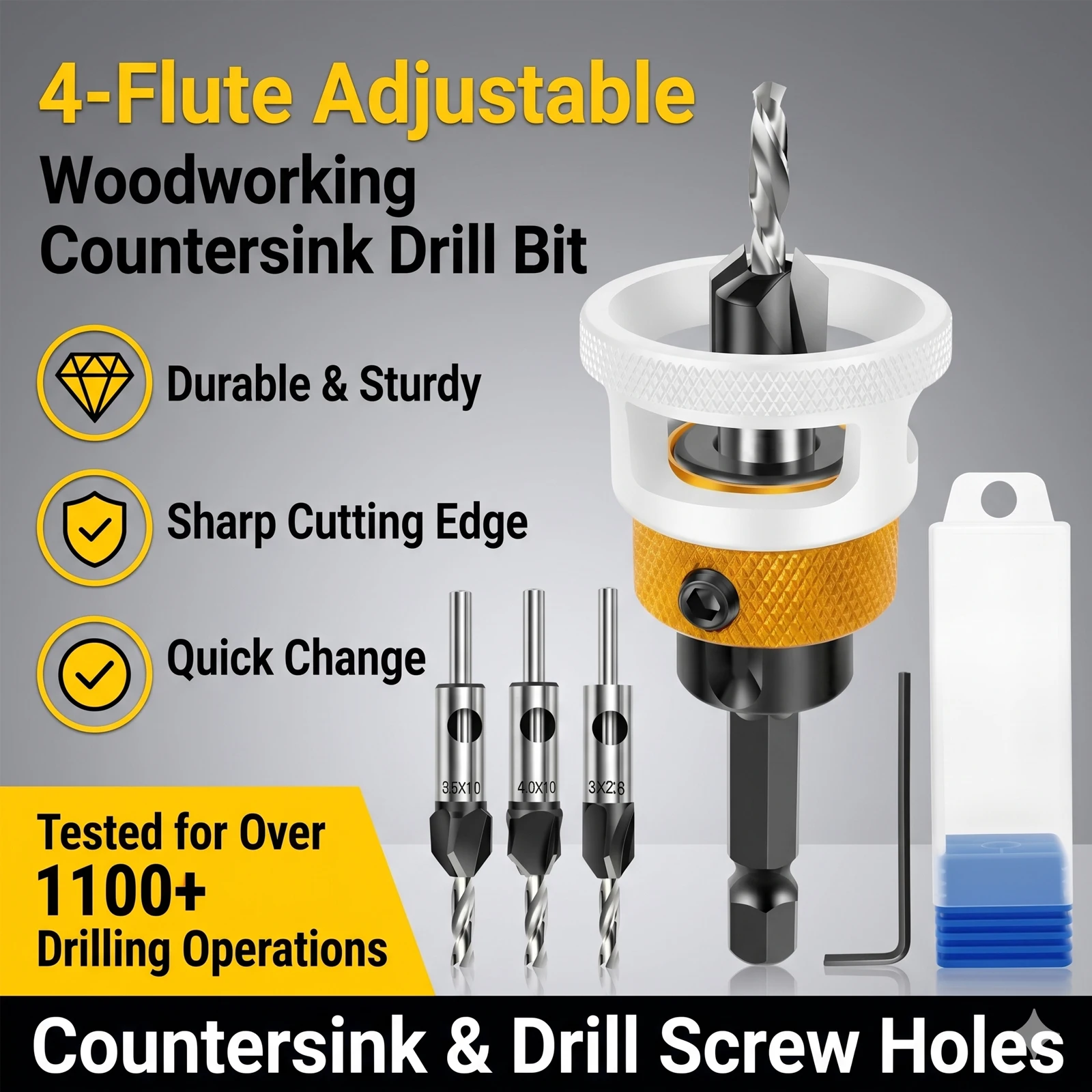 Zahloubení vrtačka kousek sada slitina postavit, spirála flétna, nastavitelný hloubka stop s 4 velikostech (2.8-4mm) vrtačka bitech pro dřevo, MDF