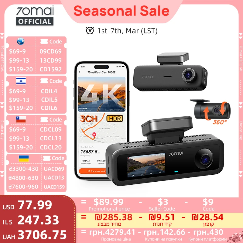 70mai 4K T800E 3-channel palubní kamera přední zadní vnitřní 3čepel v 1 hlas ovládání podpora 24hours parkovací supercapacitor GPS 4K auto DVR
