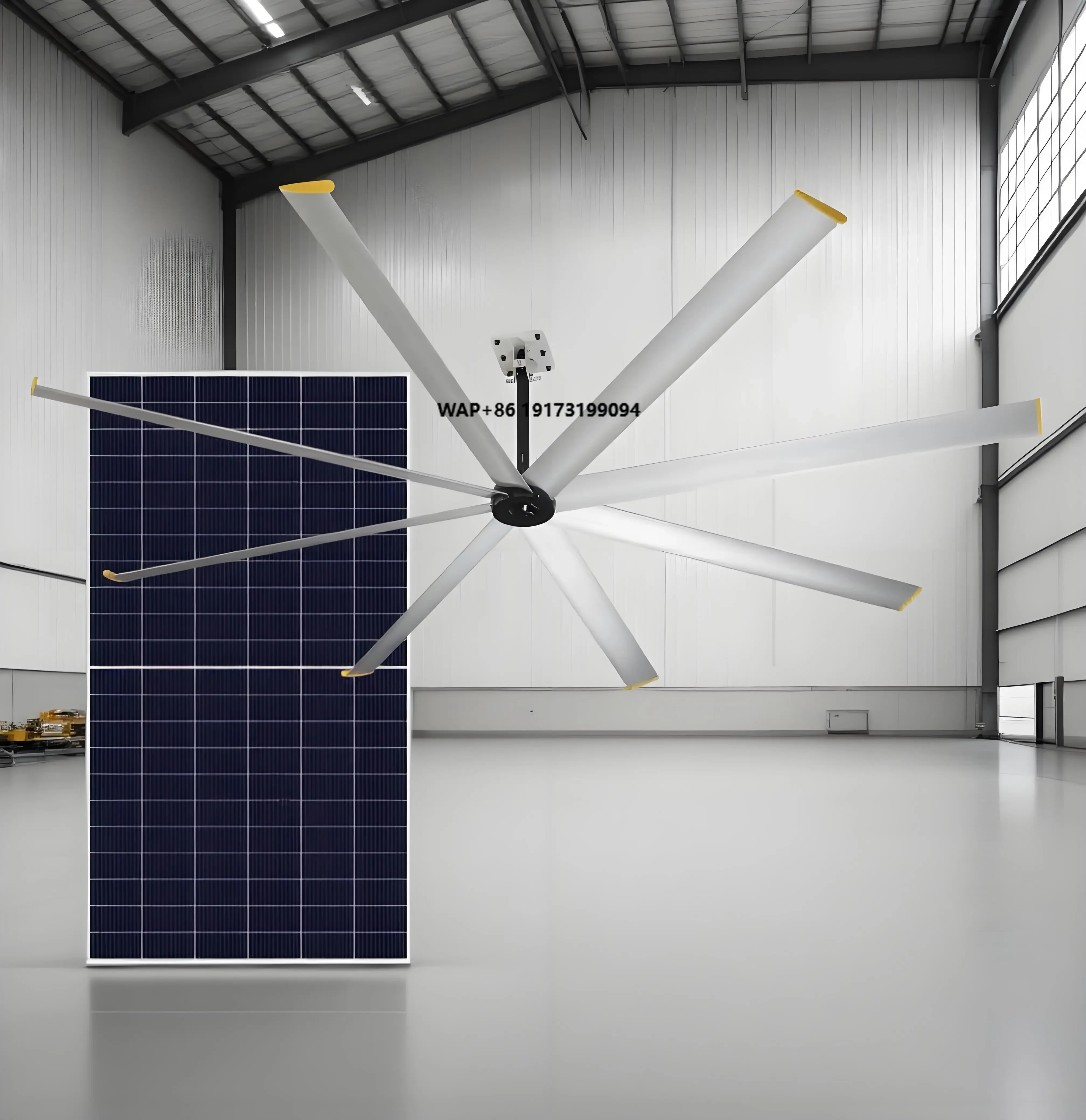 Solární napájené HVLS strop fanoušek 10ft 3m s 555W panel & ip68 BLDC motorový, iot ovládání