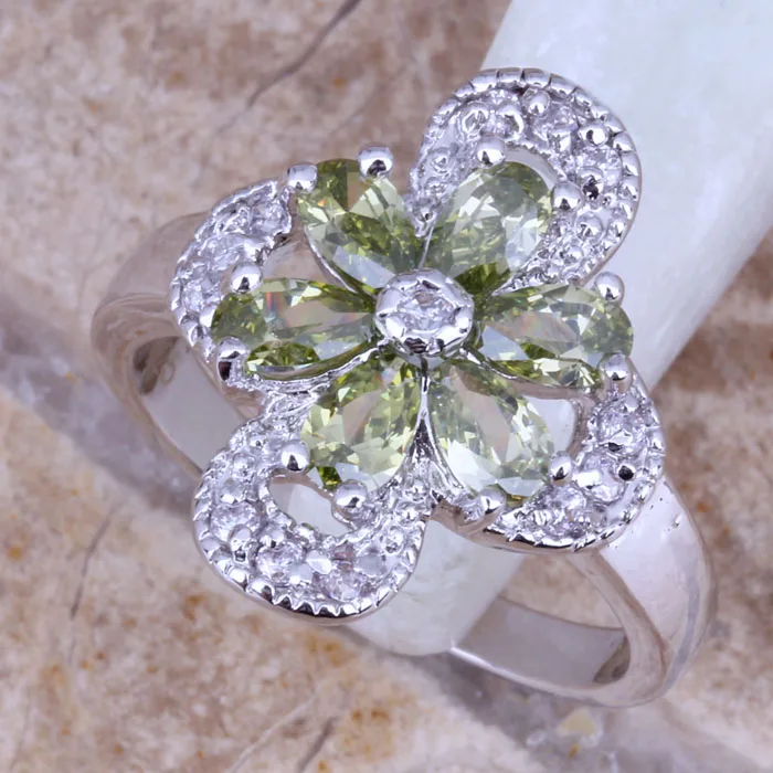 Hladký zelená peridot bílá CZ stříbro pokovené stamped kvést prsten rozměr 6pro / 7 / 8 / 9 R0187