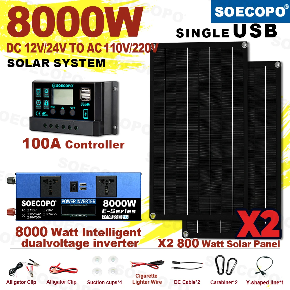 SOECOPO 8000W solární systém zakončit solární souprava pro domácí 6000w kemping stejnosměrný 12V - střídavého 110V/220V invertor USB 5V/1.5A 2*solar panely
