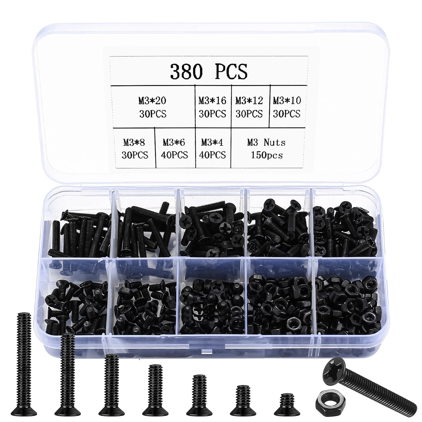 M3 plochý hlava stroj šrouby a šestihranná ořechy souprava, 380 ks černá zapuštěný hlava phillips šrouby šrouby ořechy sortiment souprava