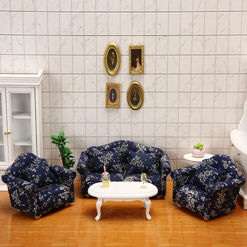 Miniaturní domeček pro panenky nábytek modelka modrá látka malý květinová pohovka vysoký konec pohovka okrasa dřevěný materiál domácí žití scéna