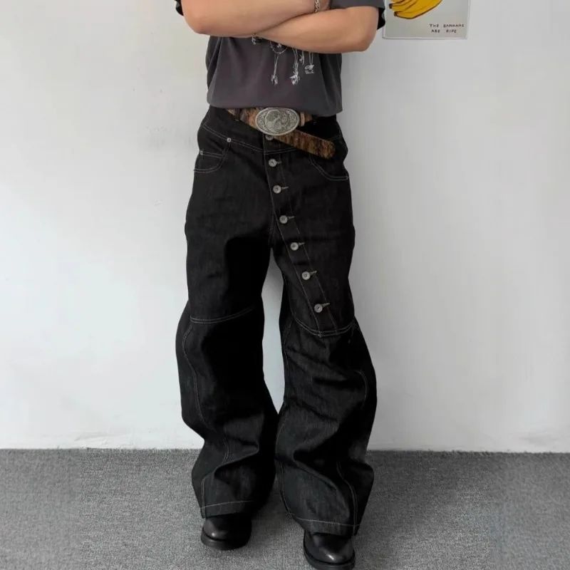 KIDWHXR muž široká hohavice kalhoty pouliční oblečení jednořadového volné pánský džínové kalhoty vintage jednoduchý ležérní mid pás sepraná muži kalhoty