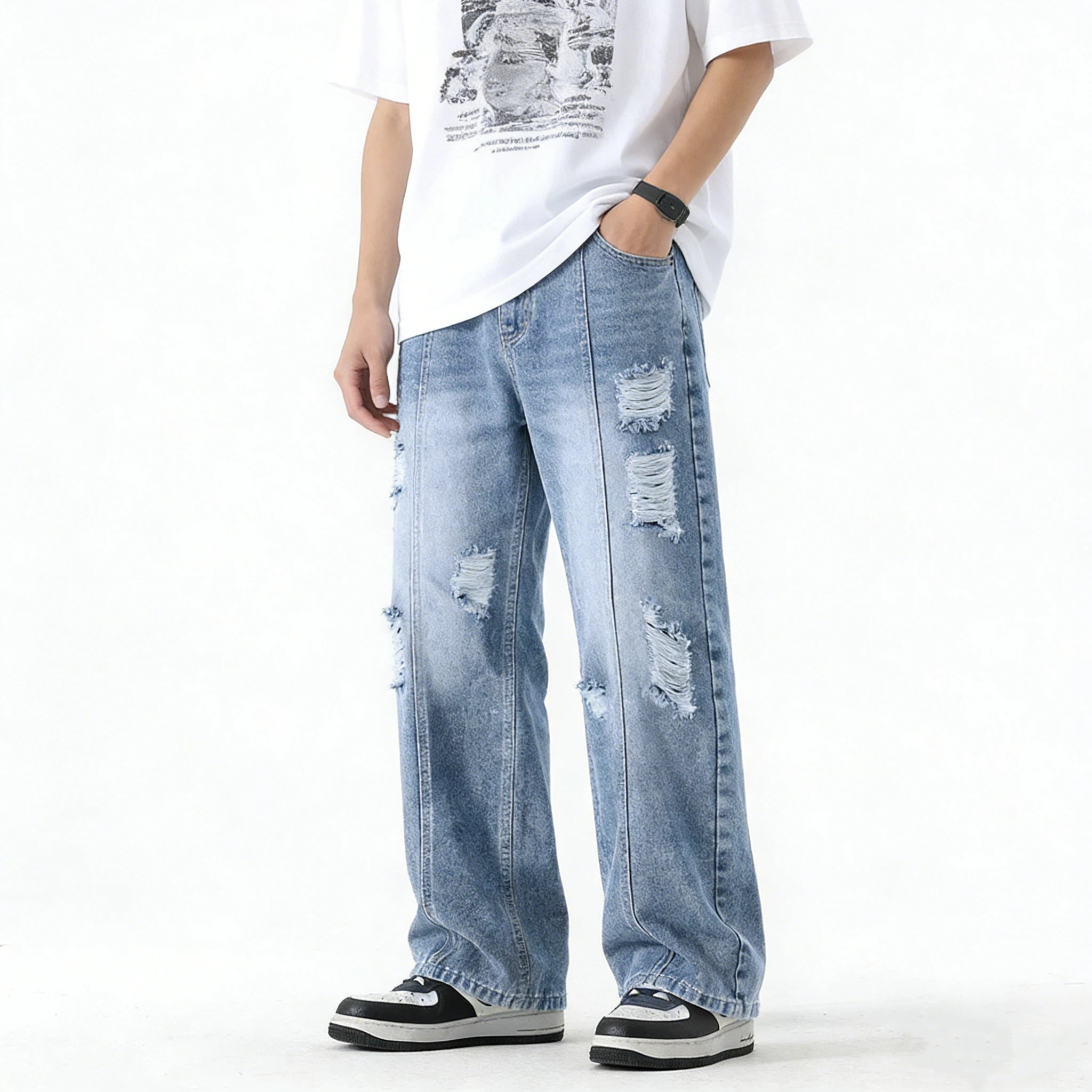Pánské y2k styl ripped džíny přímo noha sepraná džínové kalhot ležérní pouliční oblečení přímo noha kalhot pro muži boky chmel volné džíny