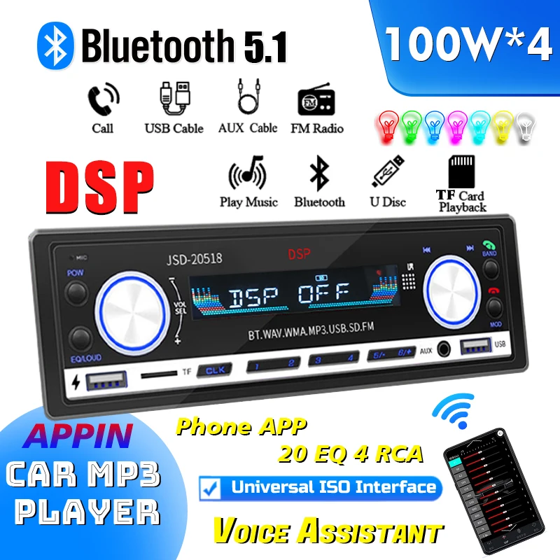 Auto mp3 Bluetooth hráč s DSP, app tuningu. 7-color světel, usb/tf card/fm radio/aux s high-fidelity audio a 100aw × 4