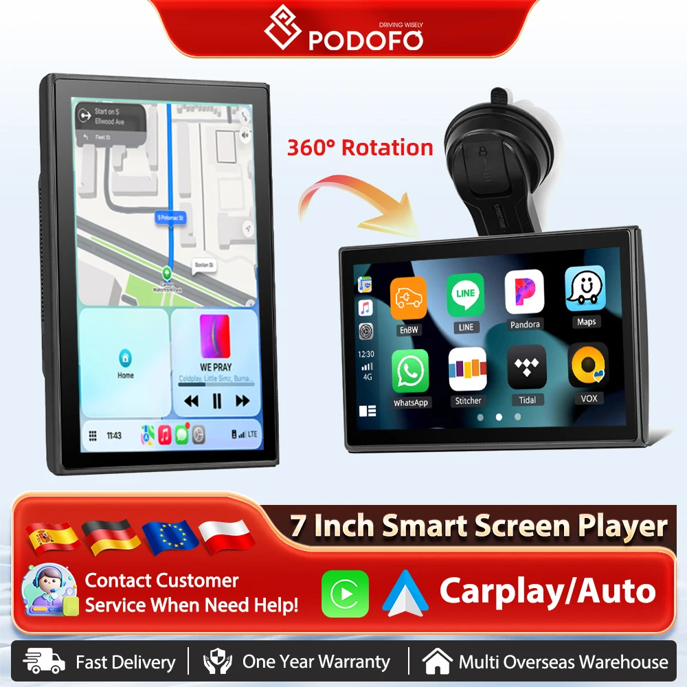 Podofo 7'' bezdrátový Carplay Android auto auto DVR chytrý obrazovka hráč rotační obrazovka noc vidění brian wayne transeau airplay airplay Android litého