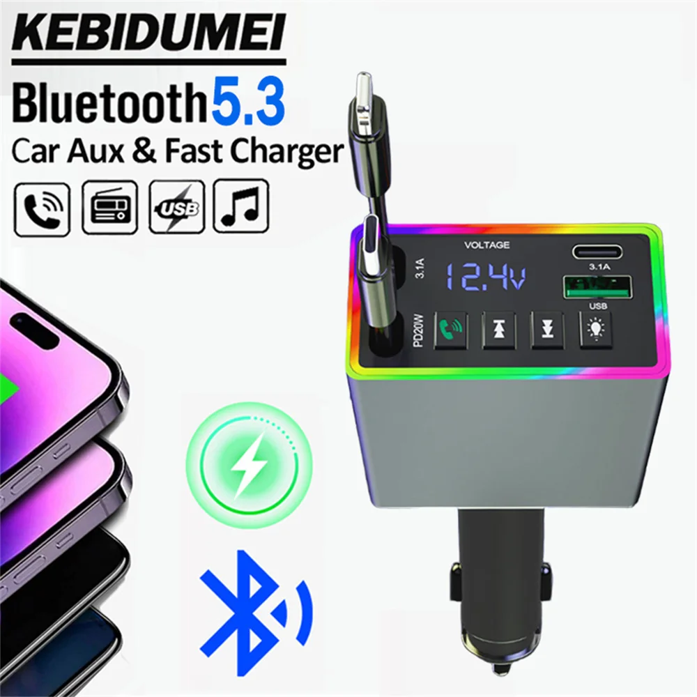 KEBIDUMEI Bluetooth 5.3 auto handsfree FM rádiový vysílač 120w 4 v 1 zatažitelný telefon nabíječka RGB lehký u-disk AUX mp3 hráč souprava