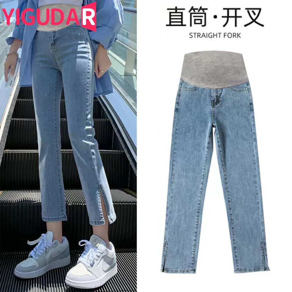 Strana rozseknout džínové těhotenské přímo dlouhé džíny široký noha volné kalhot oblečení pro těhotná ženy sloh iny těhotenství