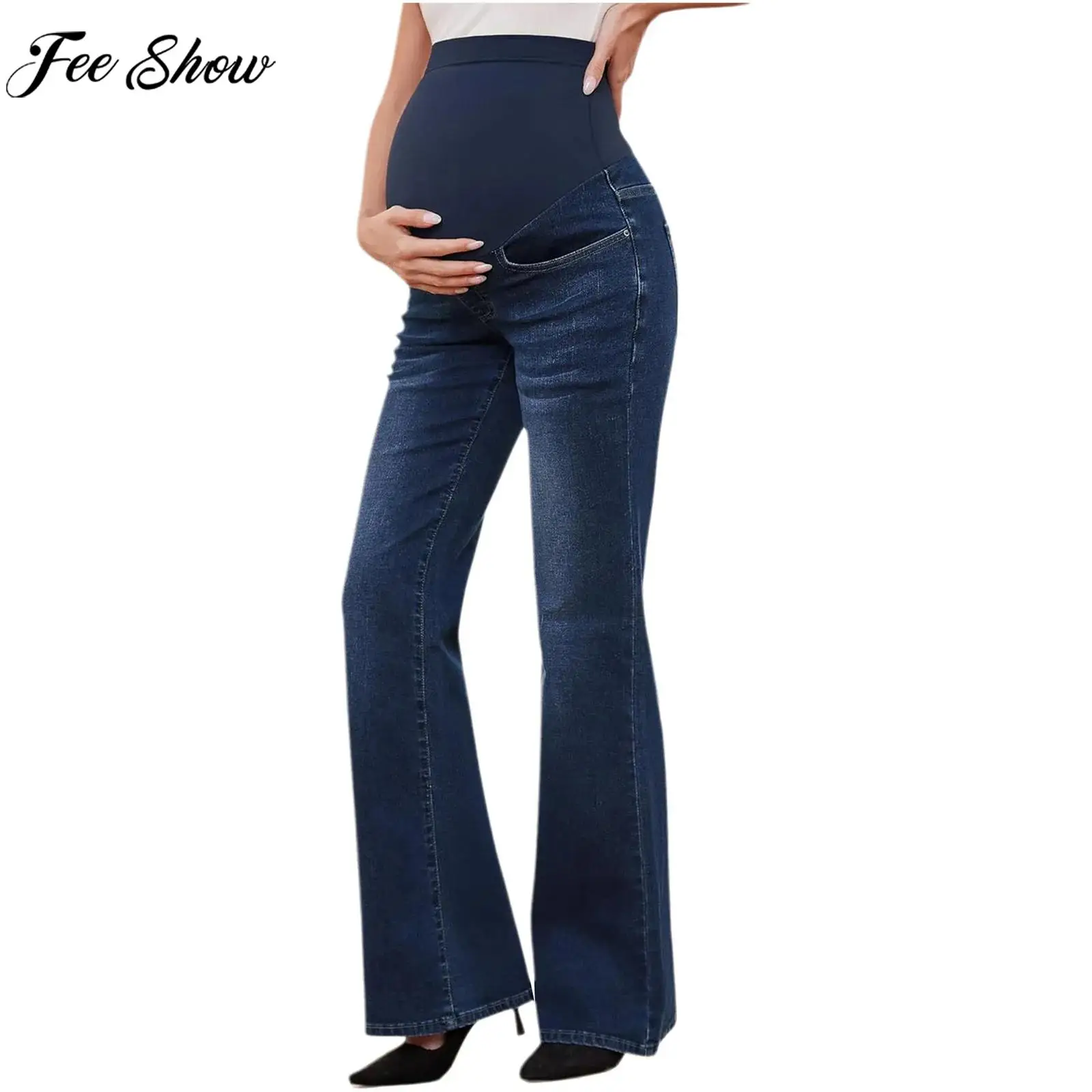 Těhotenské ležérní nad břišního plápolající džíny vysoký pás bell-bottom džínové kalhot pro joga denně úřad práce nákup dovolená