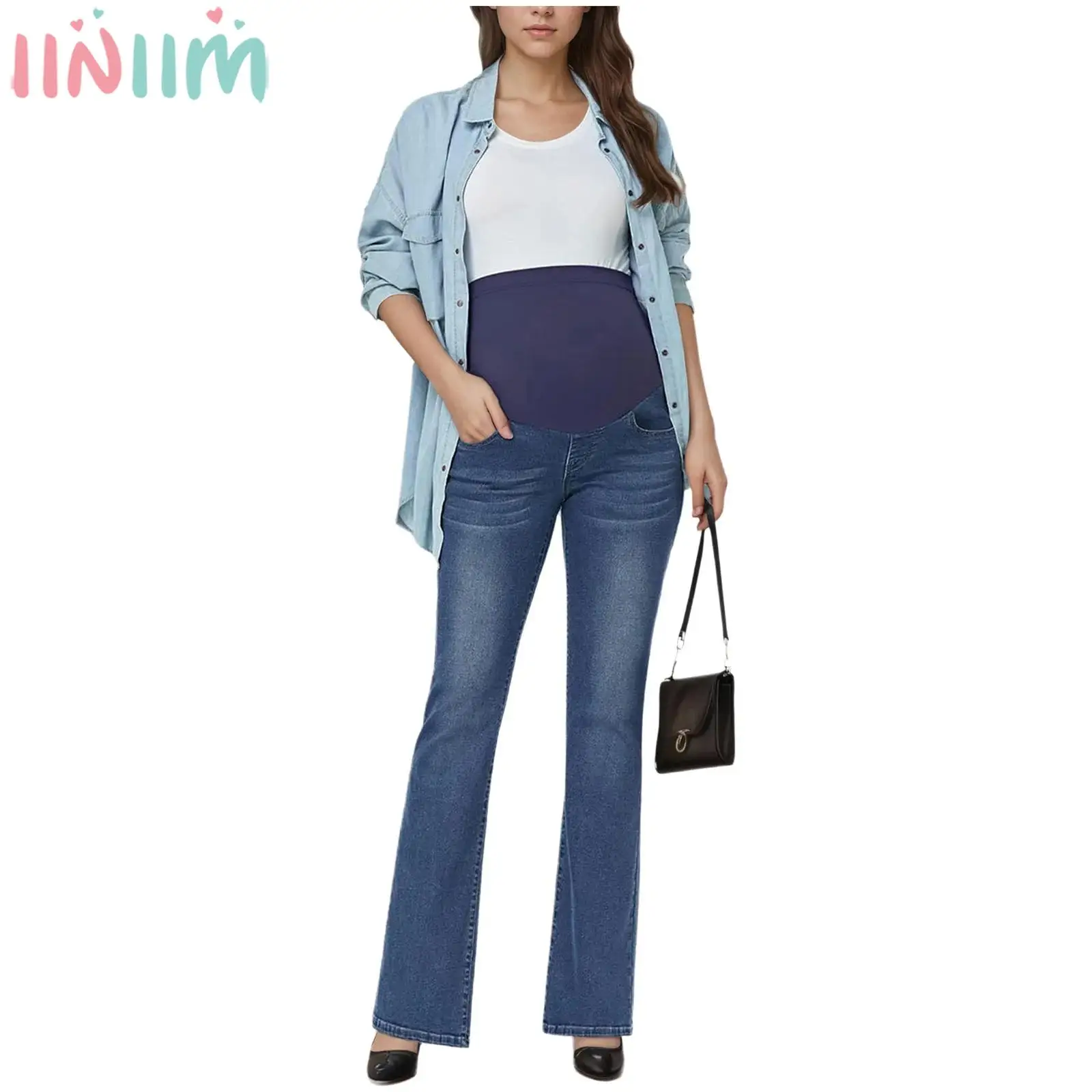 Těhotná ženy nad břišního plápolající džíny těhotenské vysoký pás bell-bottom džínové kalhot pro joga denně úřad práce ulice nést