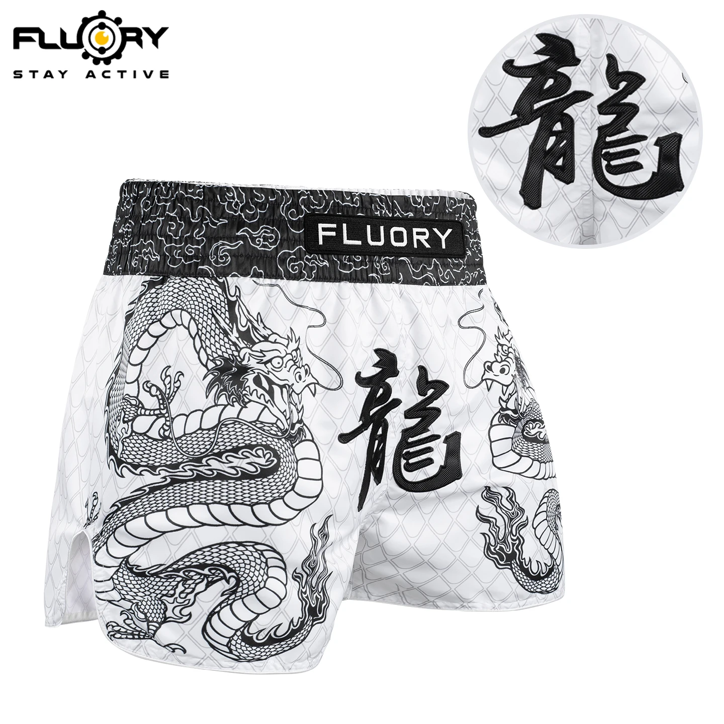 FLUORY drak tisk a výšivka prodyšné box šortky, vhodný pro potírat, MMA fitka tvoření oblečení, muay thajské šortky