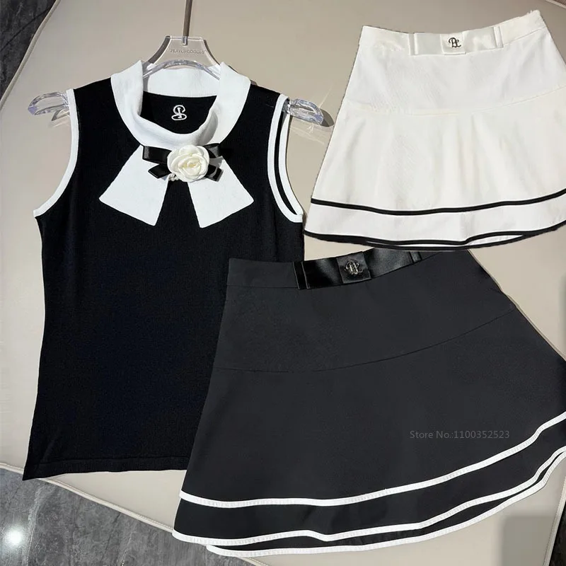 Pla ženy golf komora nejvyšší korejské růže kvést bez rukávů košile dámy dvojitý vrstva golf sukně štíhlý prohrábnout tenis sukně s krátký