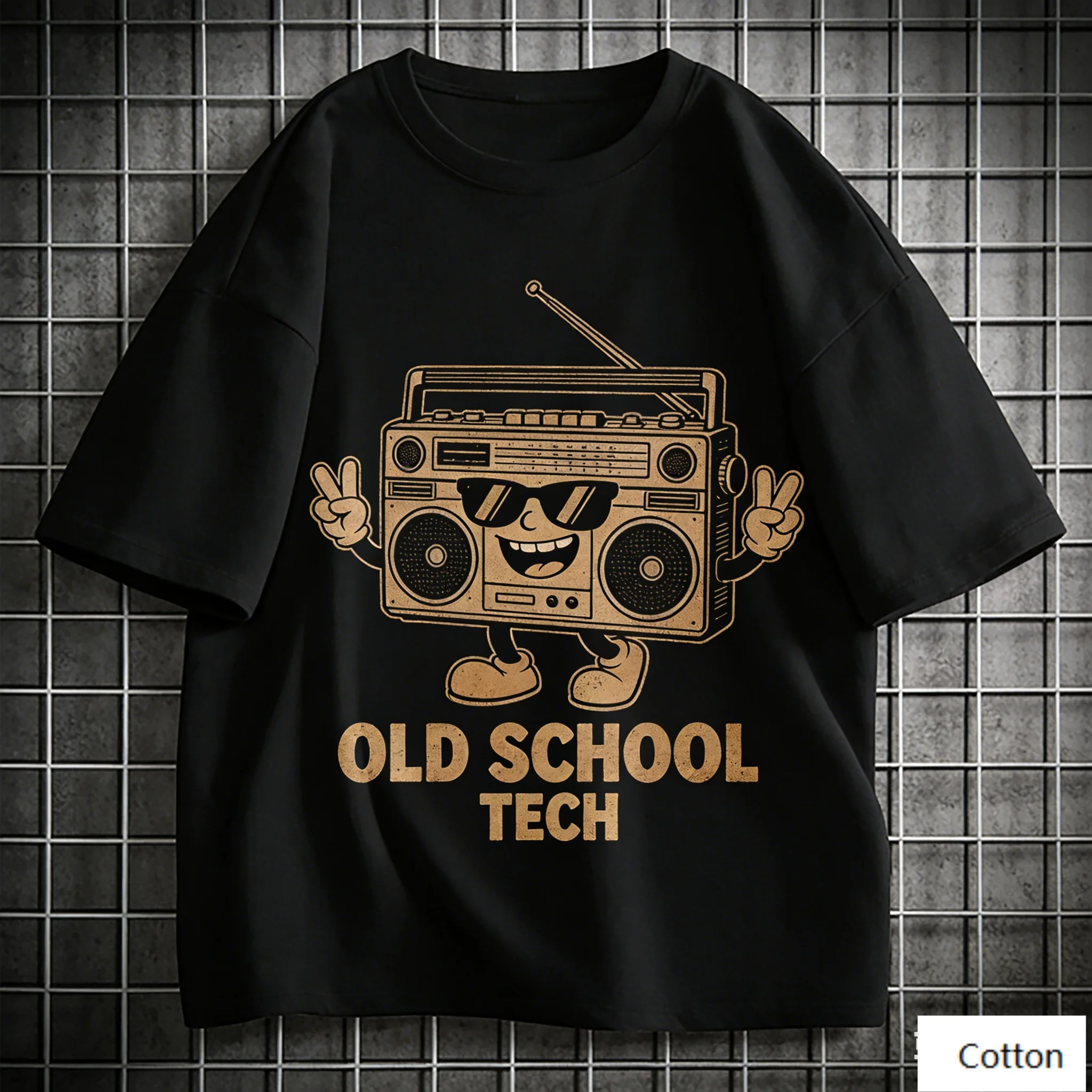 Vintage 90s boky chmel unisex bavlna tričko s retro boombox kreslený umění a distressed tisk, retro pouliční oblečení tričko