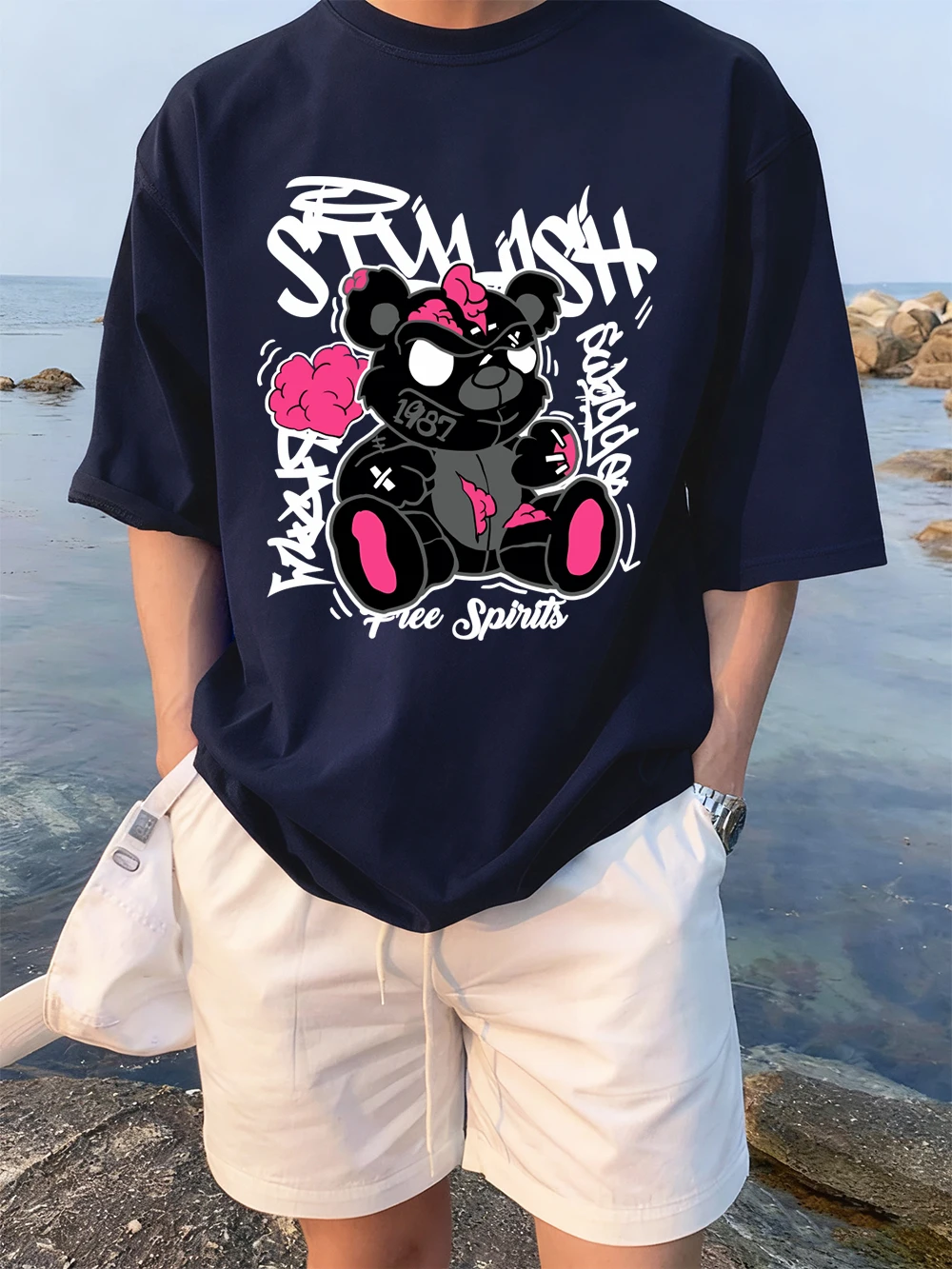 Pánská léto módní ležérní T košile krátký rukáv s učinit sen graffiti styl lettering a medvěd a lebka spojování střih