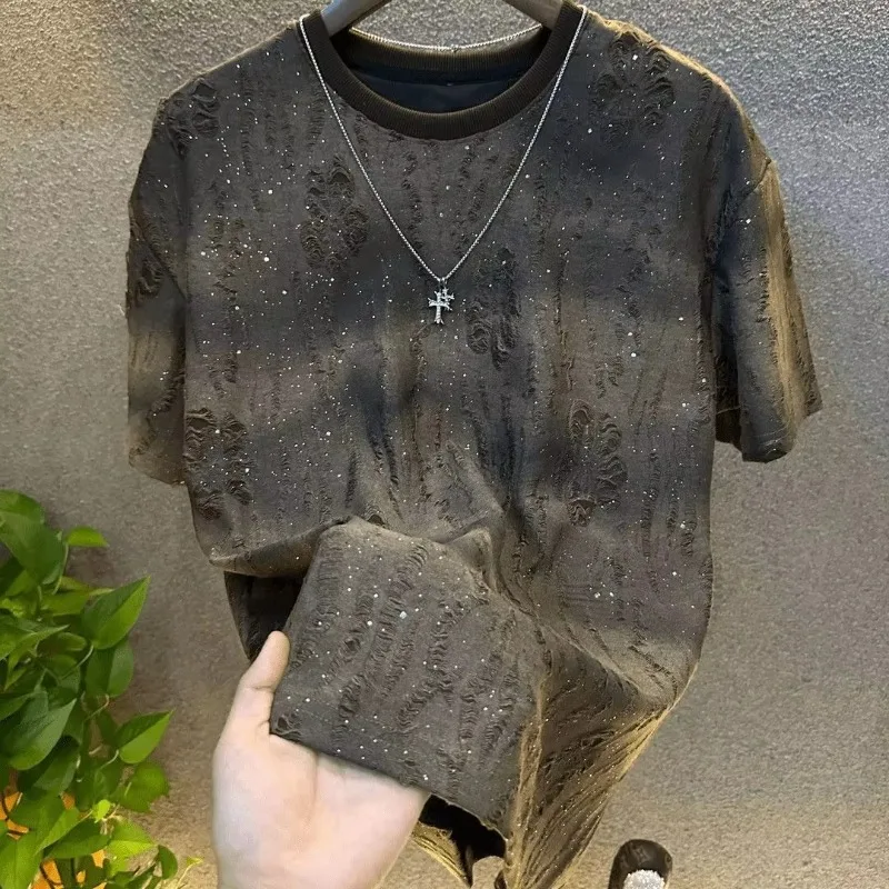 Léto dřít muži oblečení léto drahokamu nýt tričko kolo krk ležérní tričko korejské varianta pánské krátký rukávy tričko
