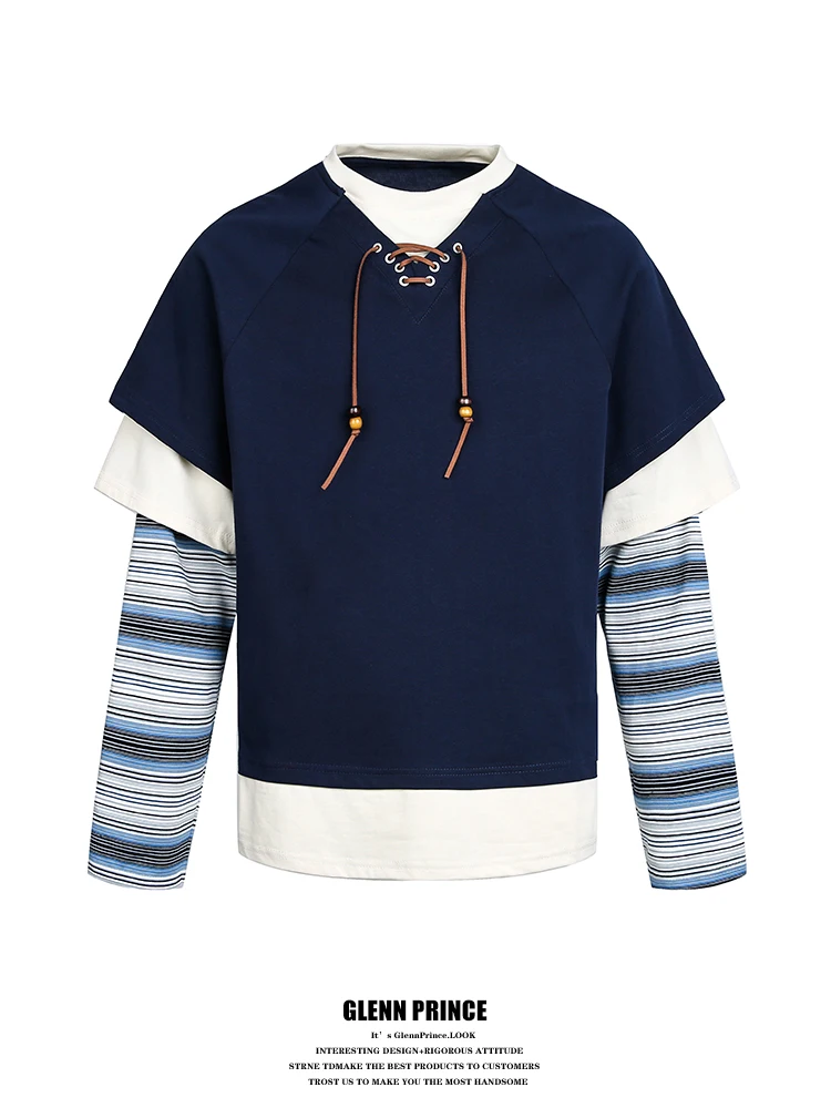 Retro pruhované patchwork lano uzel design dlouhé sve t-irt pánské volné odpovídat bavlna youthful sle pastoral vítr tee-piece ...