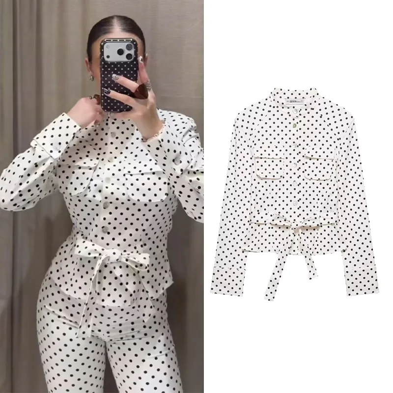 Dámská polka tečka košile bunda jaro ležérní kolo krk dlouhé rukáv s kapes pás kabáty móda ženské svrchní