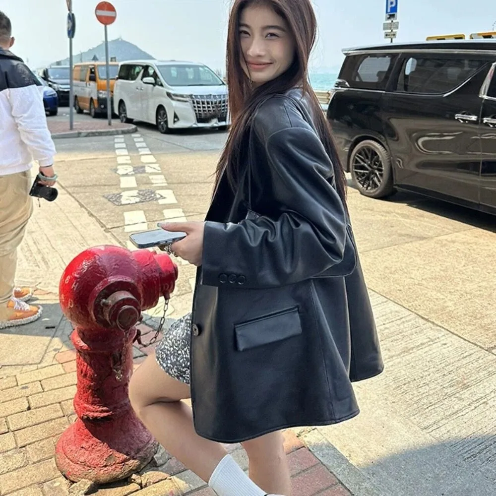 Móda klopa límec kůže bunda ženy svrchní korejské sloh oblek kůže bunda volné retro větrovka bundy svátek