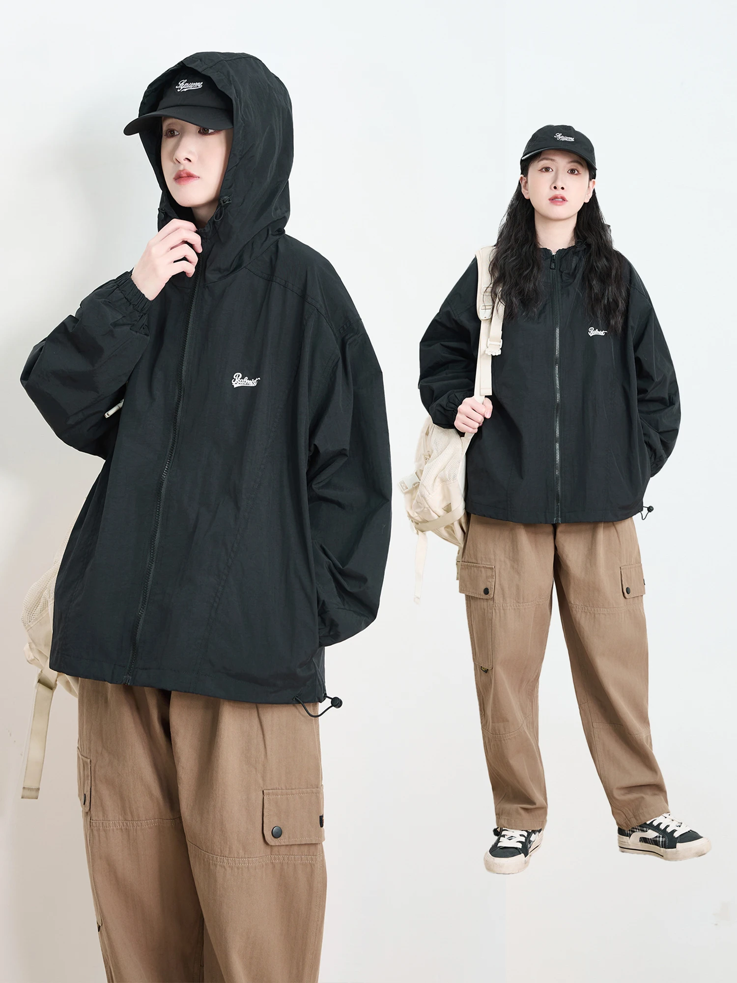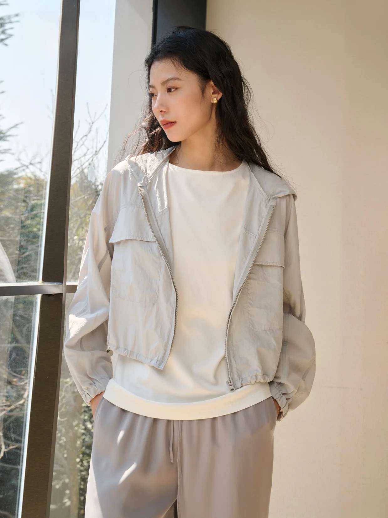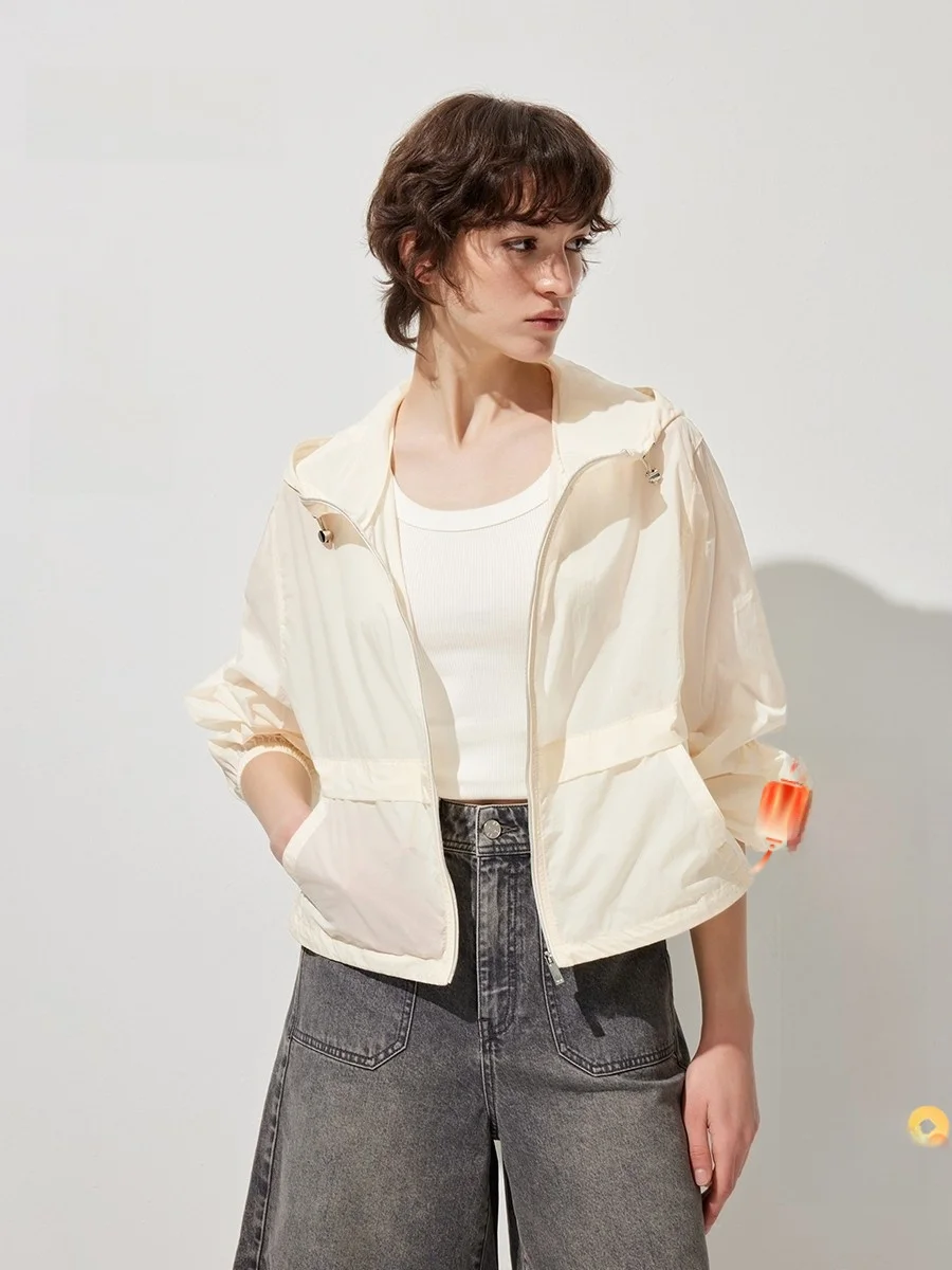 Jaro 2026 dámská volné odpovídat ort s kapucí jaet prodyšné lehoučké UV ochrana silon textilie čistý barva na zip objímka