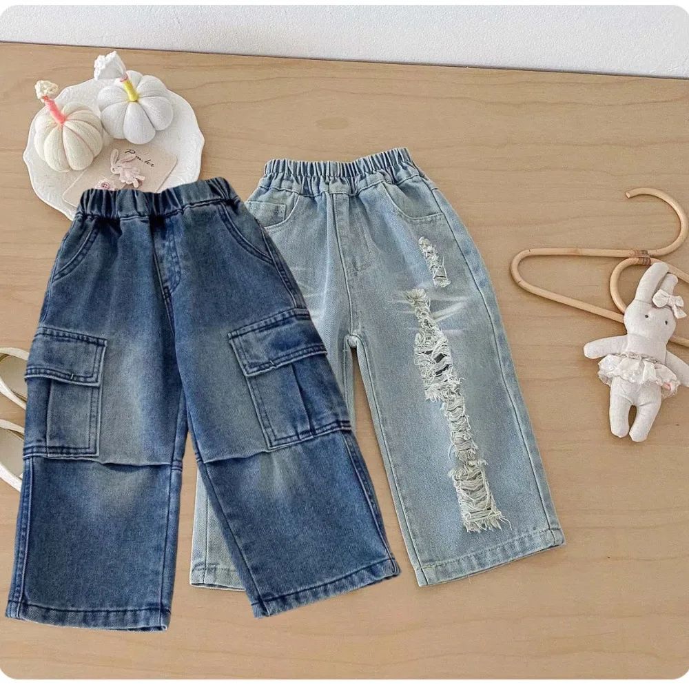 Dívčí jaro a podzim období 2026 módní hustý ulice kovboj široký noha kalhot hezký boys' punched starý kalhot versatile