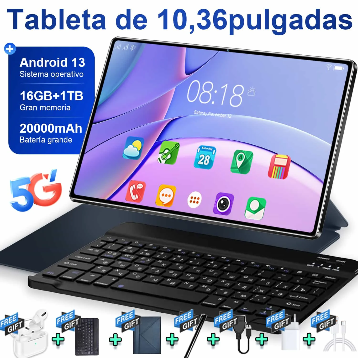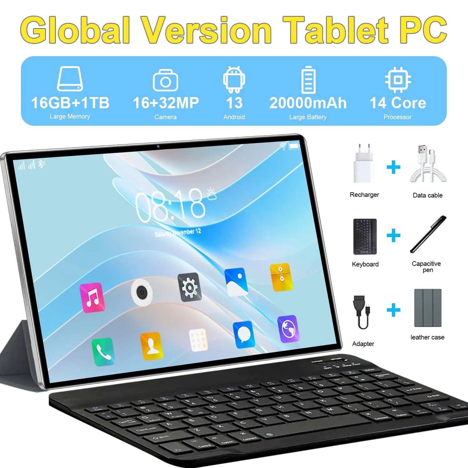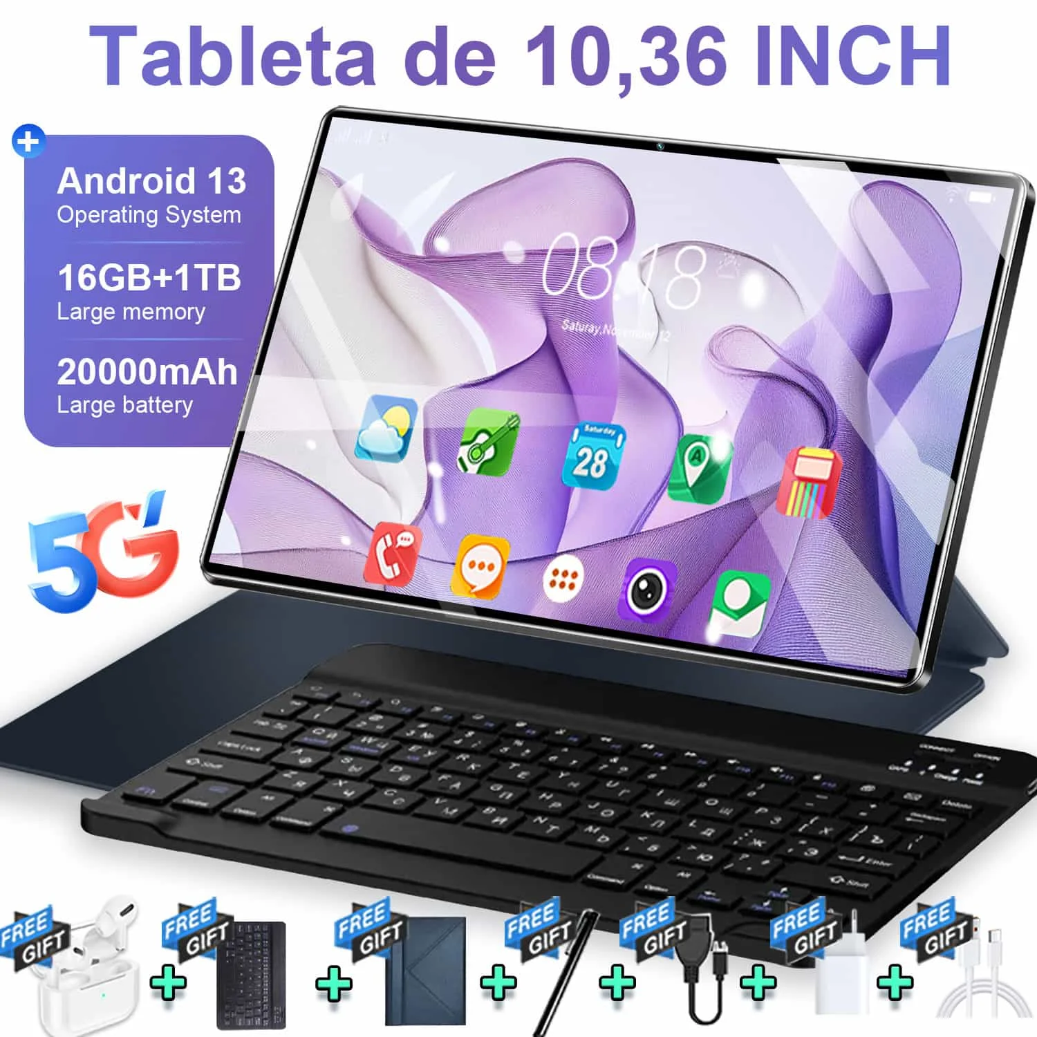 Globální varianta nový 5G 10.36 palec tablet Android 16gb beran 1TB rom 20000mah Android 13.0 WIFI sit' 14 jádra WPS úřad 4K hd obrazovka tablet PC type-c s klávesnice Bluetooth