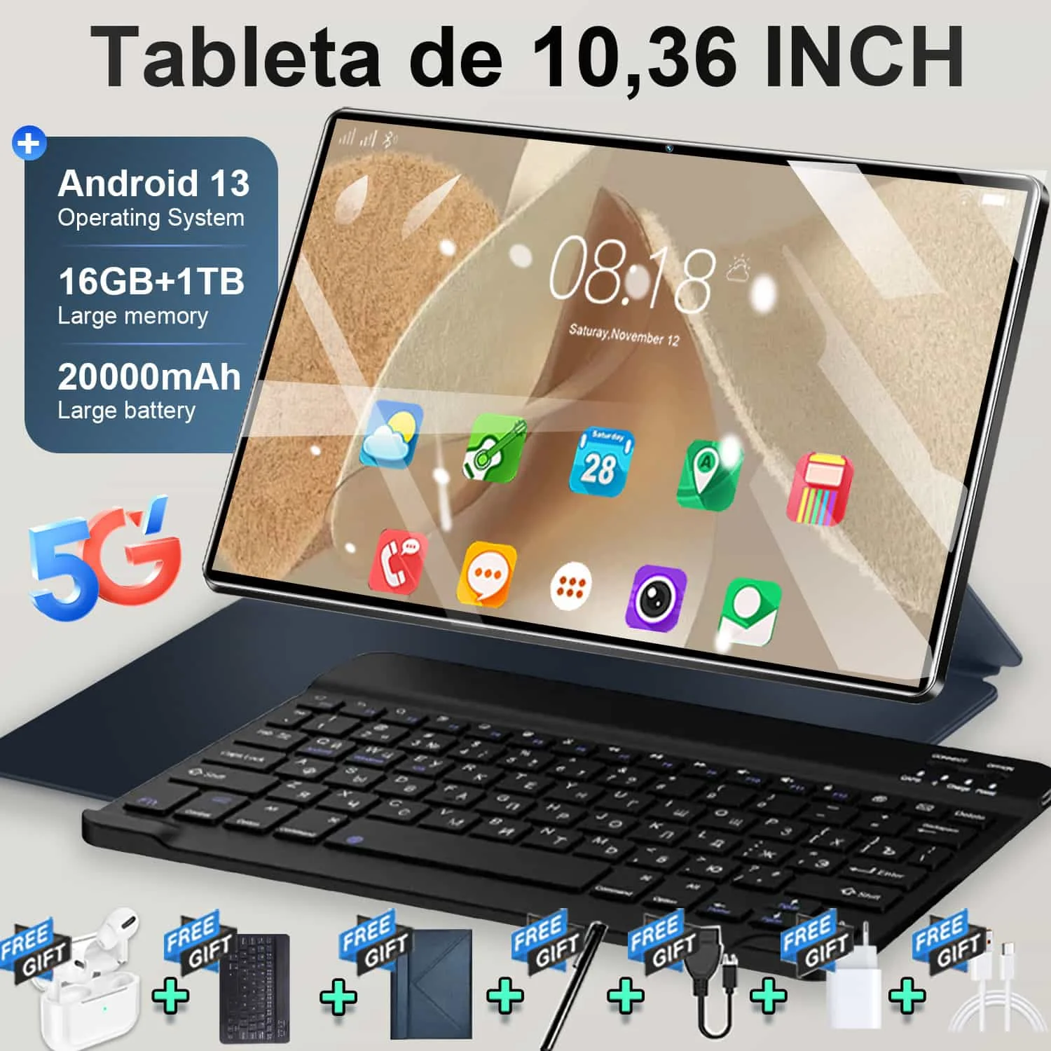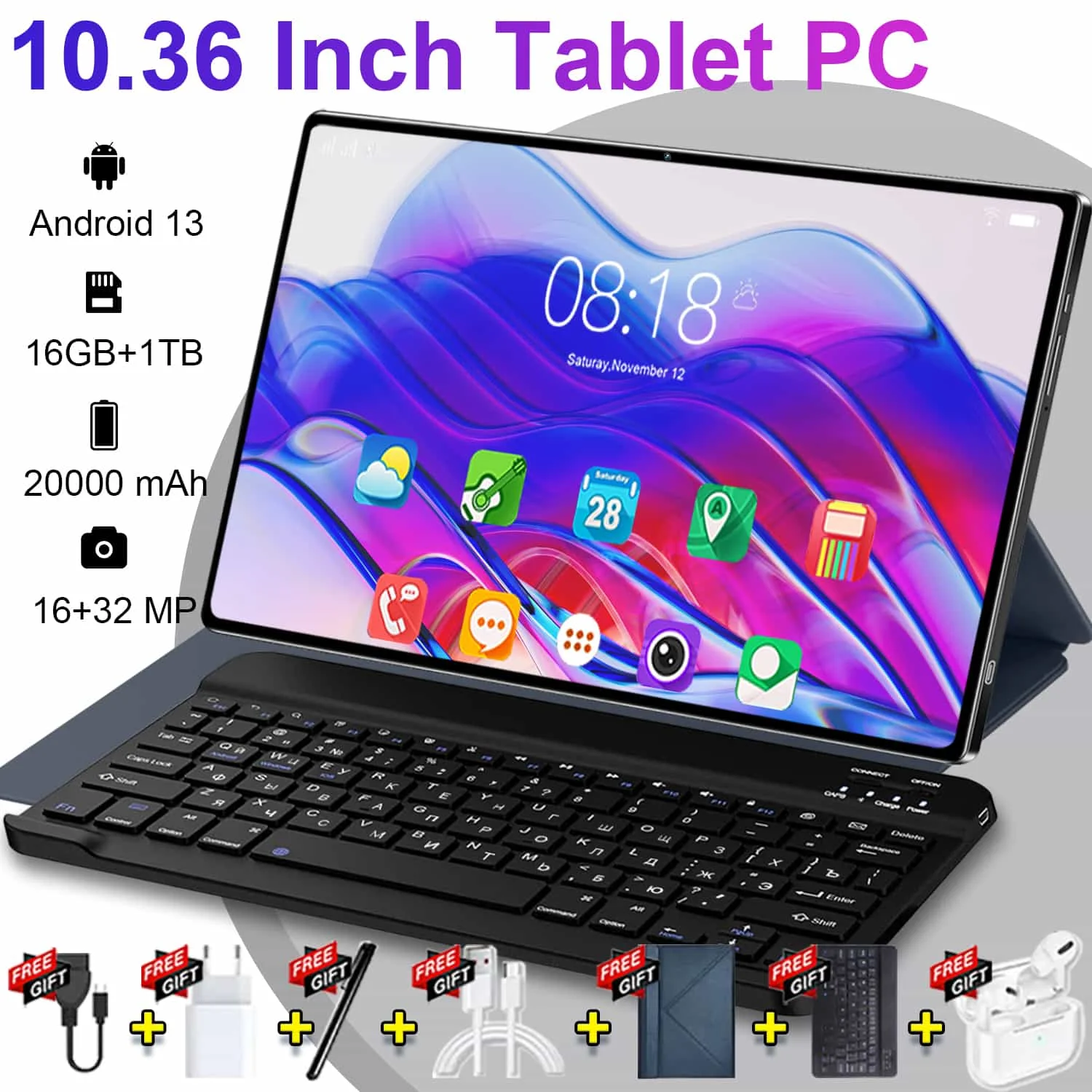 Globální varianta nový 5G 10.36 palec tablet Android 16gb beran 1TB rom 20000mah Android 13.0 WIFI sit' 14 jádra WPS úřad 4K hd obrazovka tablet PC type-c s klávesnice Bluetooth