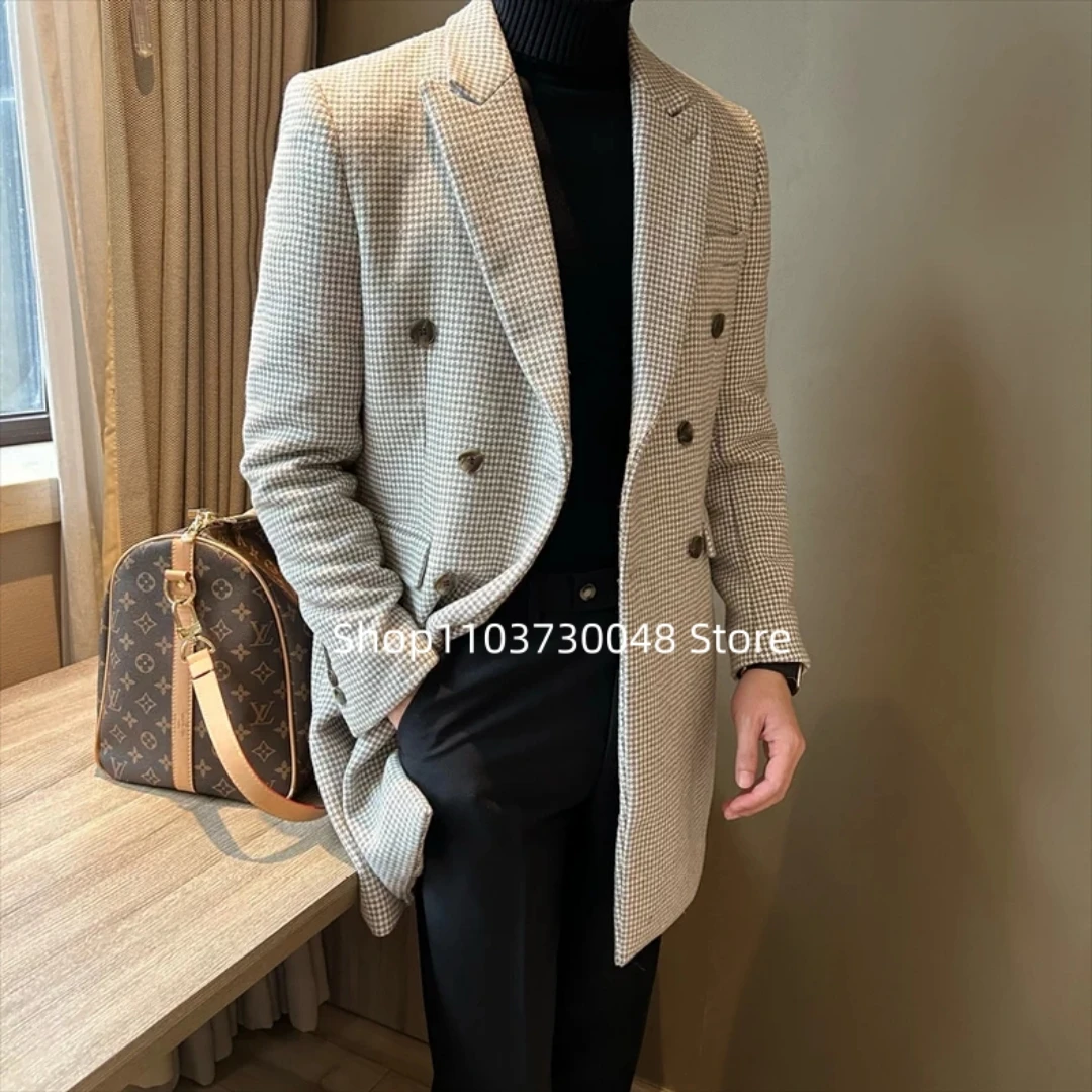 Muži béžová houndstooth dlouhé kabát vlna blend dvojitý breasted oblek bunda podnikání svrchník chytrý ležérní muž sako pro večírek ples