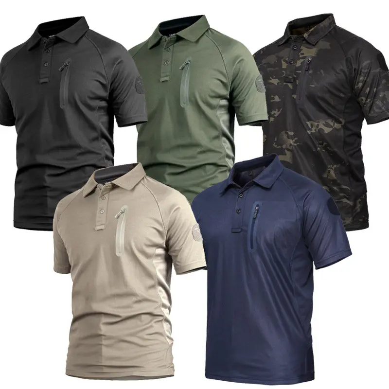 Khaki černá taktická outdoorové tričko, rychlý schnoucí prodyšné sportovní polo košile, krátký rukáv límec, vhodný pro mountaineeri