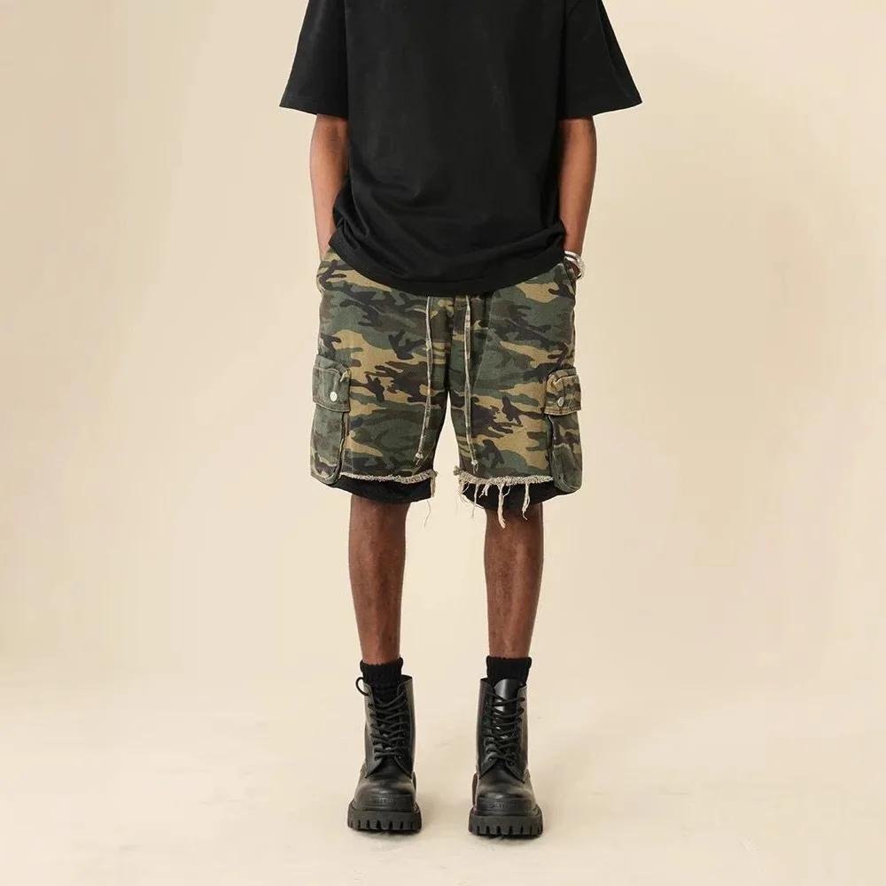 Americký pouliční oblečení raw-edge sepraná vintage kamufláž šortky uvolněné odpovídat více kapes outdoorové práce camo oříznuté džíny krátký
