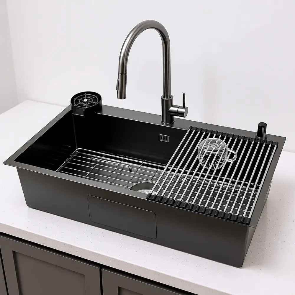 Po jednom miska kuchyň bortit se s 40x45 cm rozměry, černá nanoe povlak, 360àƒâƒà‚â‚àƒâ‚à‚° otočný ťuknout, mýdlo dávkovač, a rinser