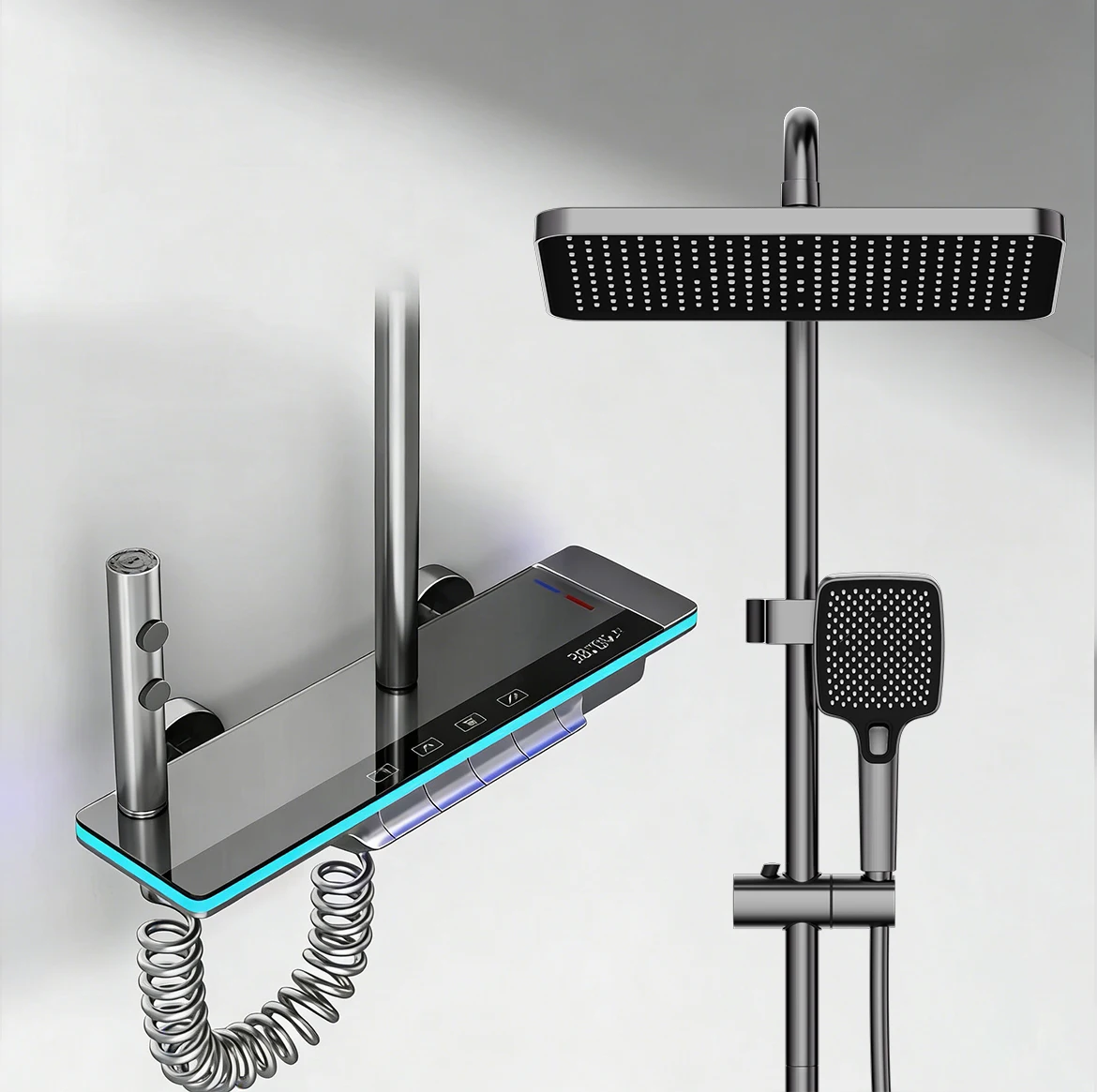 Mezera aluminium sprcha sada digitální displej sprcha systém klavír knoflík, okolní lehký koupelna pípa a sprcha hlava