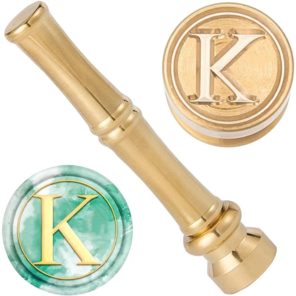 Dopis K pečeť náznak mosaz pečetního razítka 15mm zlatý kov retro vintage abeceda počáteční mini náznak s bambus tyčinka