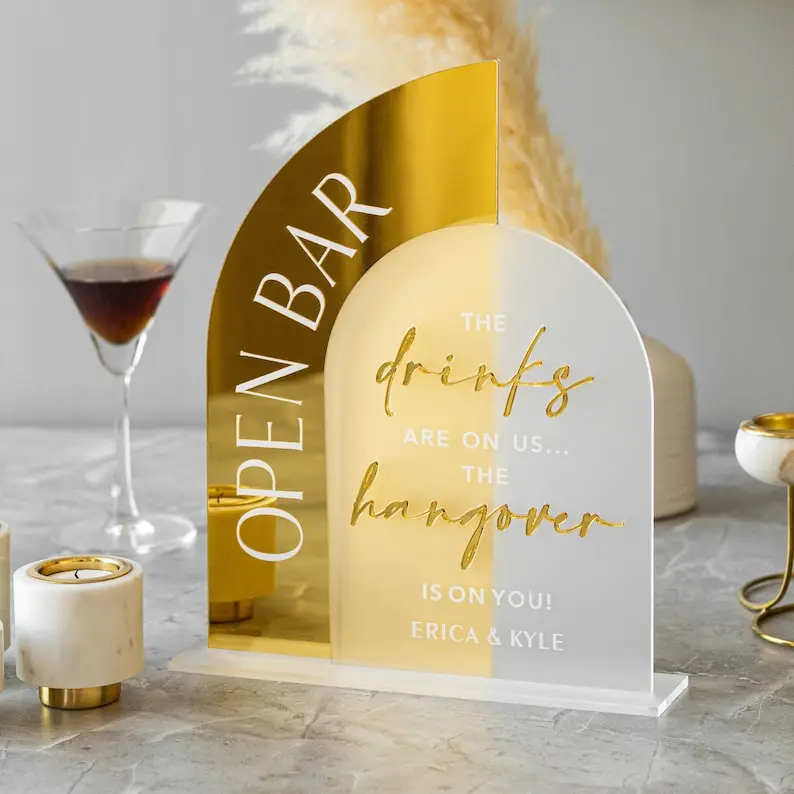 Klenuté otevřený pult svatební značka, otevřený pult akryl značka, svatební stůl dekorace, zlato zrcadlo svatební pult značka, zlato akryl nápoje značka