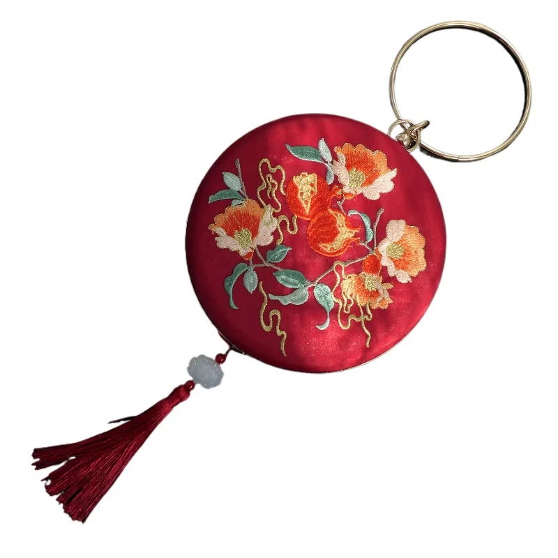 Červená s hanfu cheongsam huba zlato brašna národní vítr granátové jablko kvést výšivka kvést brašna nevěsta brašna