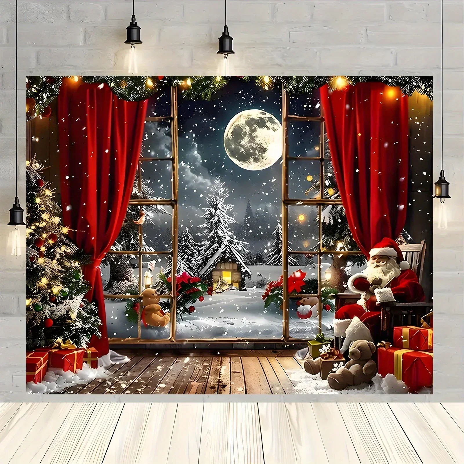 2D plochý, 1ks vánoce zima wonderland fotka backdrop prapor - santa claus, červená záclony, zasněžené okno scéna - halové