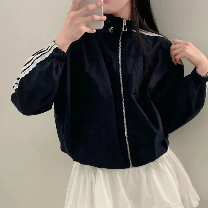 Krátký dámská baseballová styl bunda korejské varianta dvojitý vrstva spojování krajka stříhat stahovací pás ležérní hubený opalovací krém nejvyšší