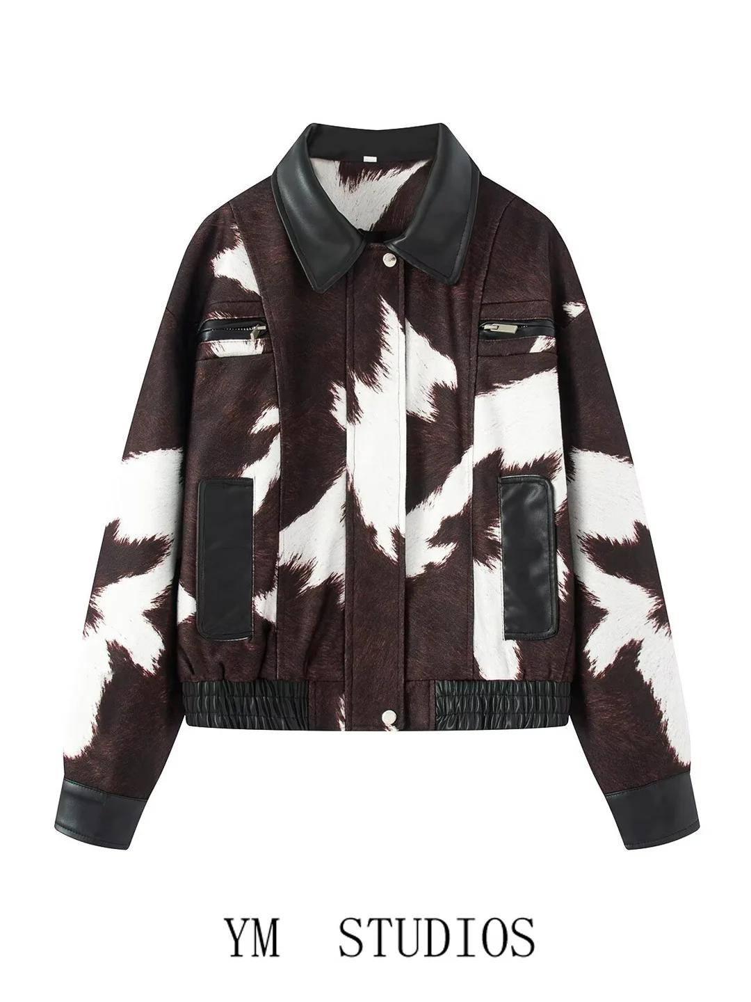 Dámská americký styl patchwork PU kůže krátký bunda límec design skot střih svrchní jaro 2026 volné odpovídat dlouhé rukáv