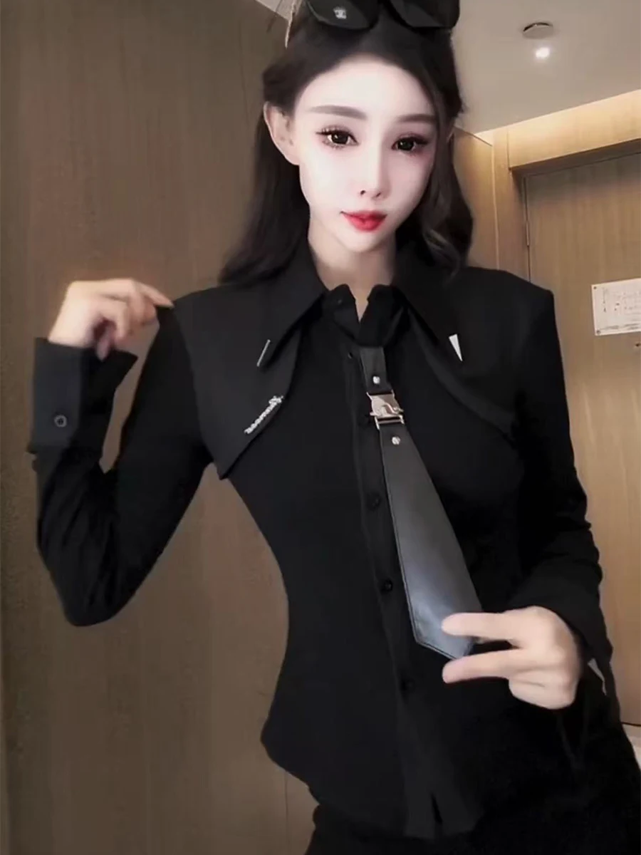 Vysoký límec pu kůže elegantní dámská košile černá jednořadového dlouhé rukáv podzim topy ženské vysoký ulice móda PU košile