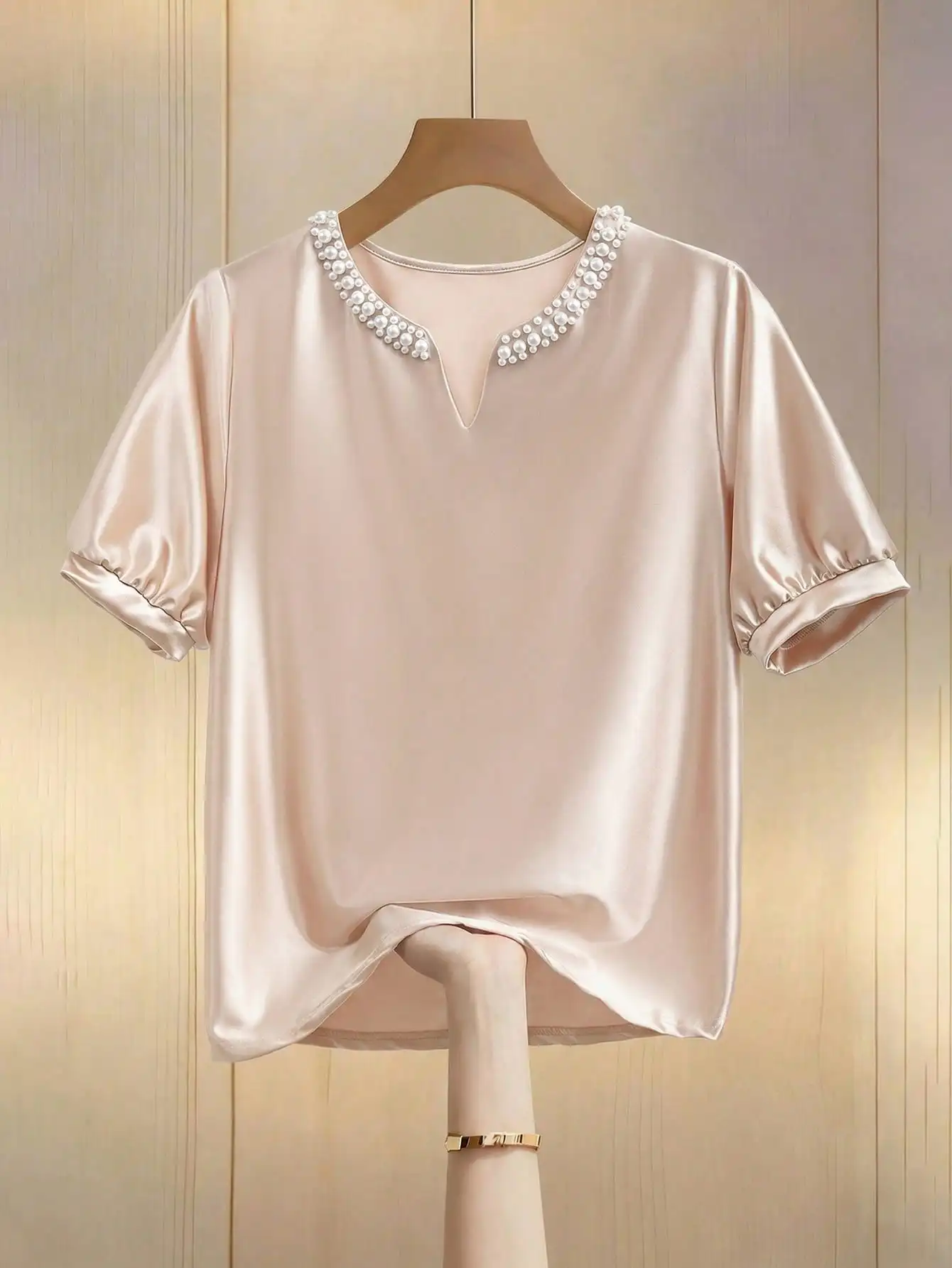 Dámská růžová šaty blůza s perla embellished V krk supět krátký rukávy elegantní satén cítit pro úřad a denně nést