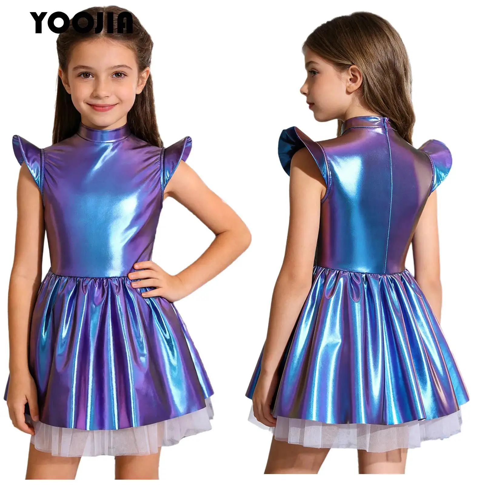 Cizinec outerspace cosplais kostým pro kůzle dívčí halloween kosmonaut robot šaty nahoře metalické leskle záblesk rukáv prohrábnout tutu šaty