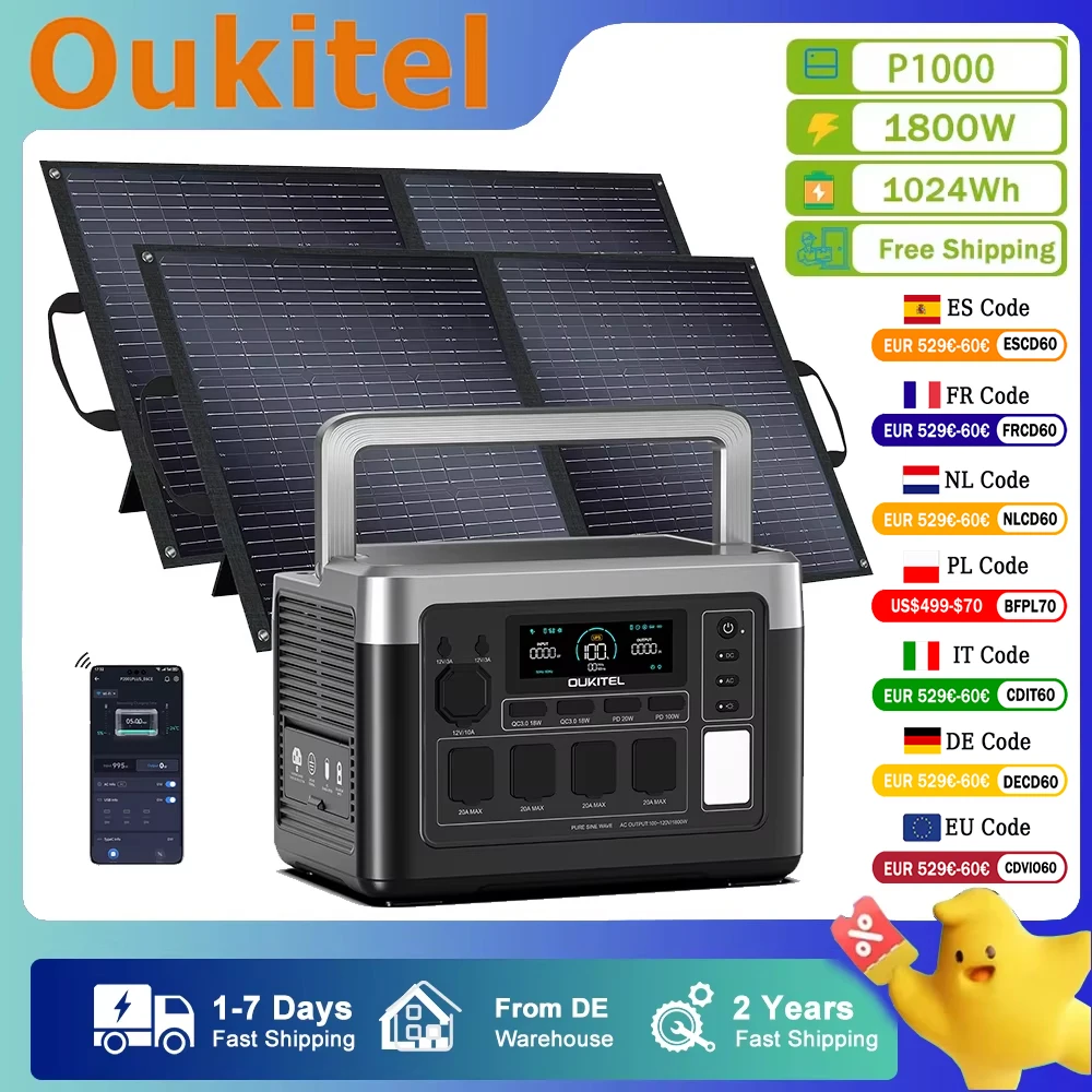 Oukitel P1000 PLUS přenosné energie nádraží 1024wh 1800W ifepo4 baterie + 2pc 100aw solární panel s 3600w temeno pro energie energie
