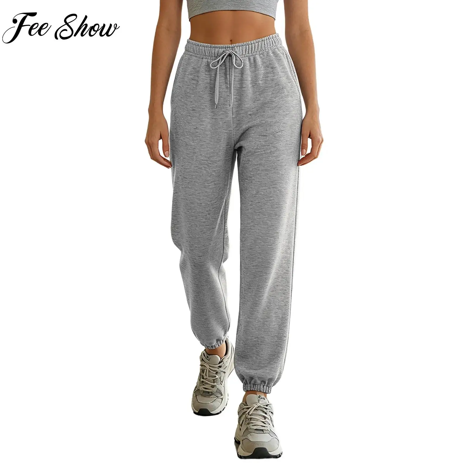 Ženy celistvý barva volné vysoký pás fleece-lined tepláky elastická stahovací ležérní sportovní kalhoty s kapes