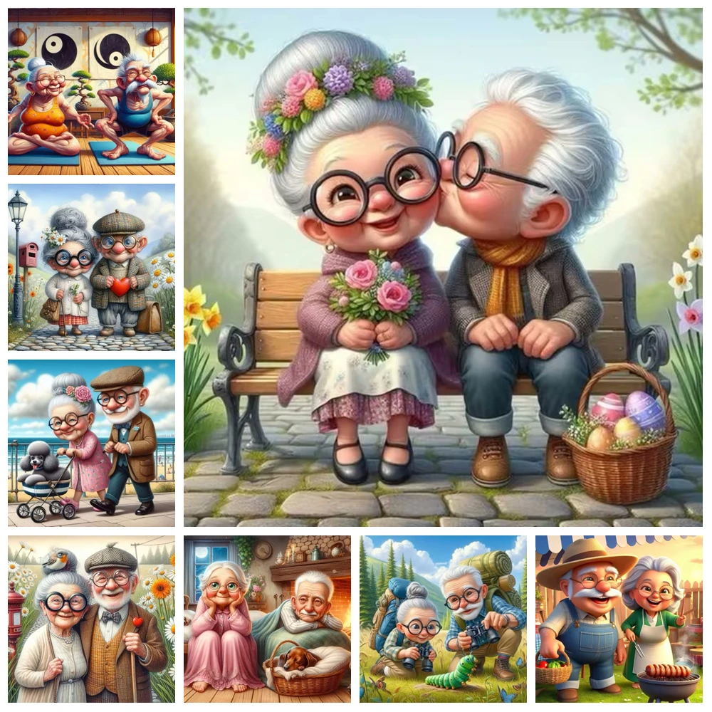 Kreslený št'astný starý manželé 5D plný kolo diamant malba soupravy, roztomilá babi a děda DIY vrtačky mozaika výšivka cross-stitch