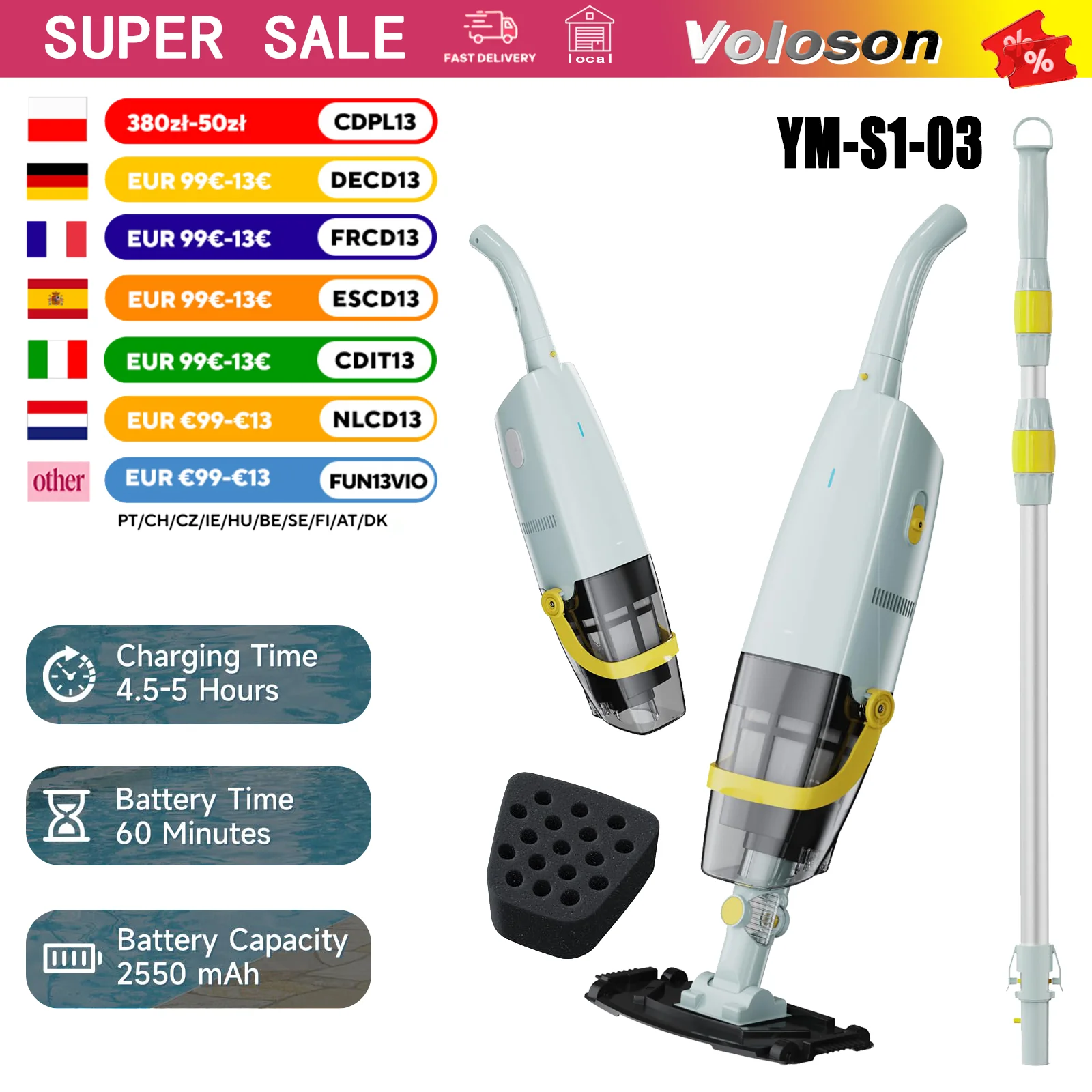 Vzkvétat YM-S1-03 modernizované akumulátorové kapesní kaluž vacuum dobíjecí kaluž čistič ipx8 vodotěsný 60 mins runtime teleskopická hýl pro above/in-ground bazény & spas