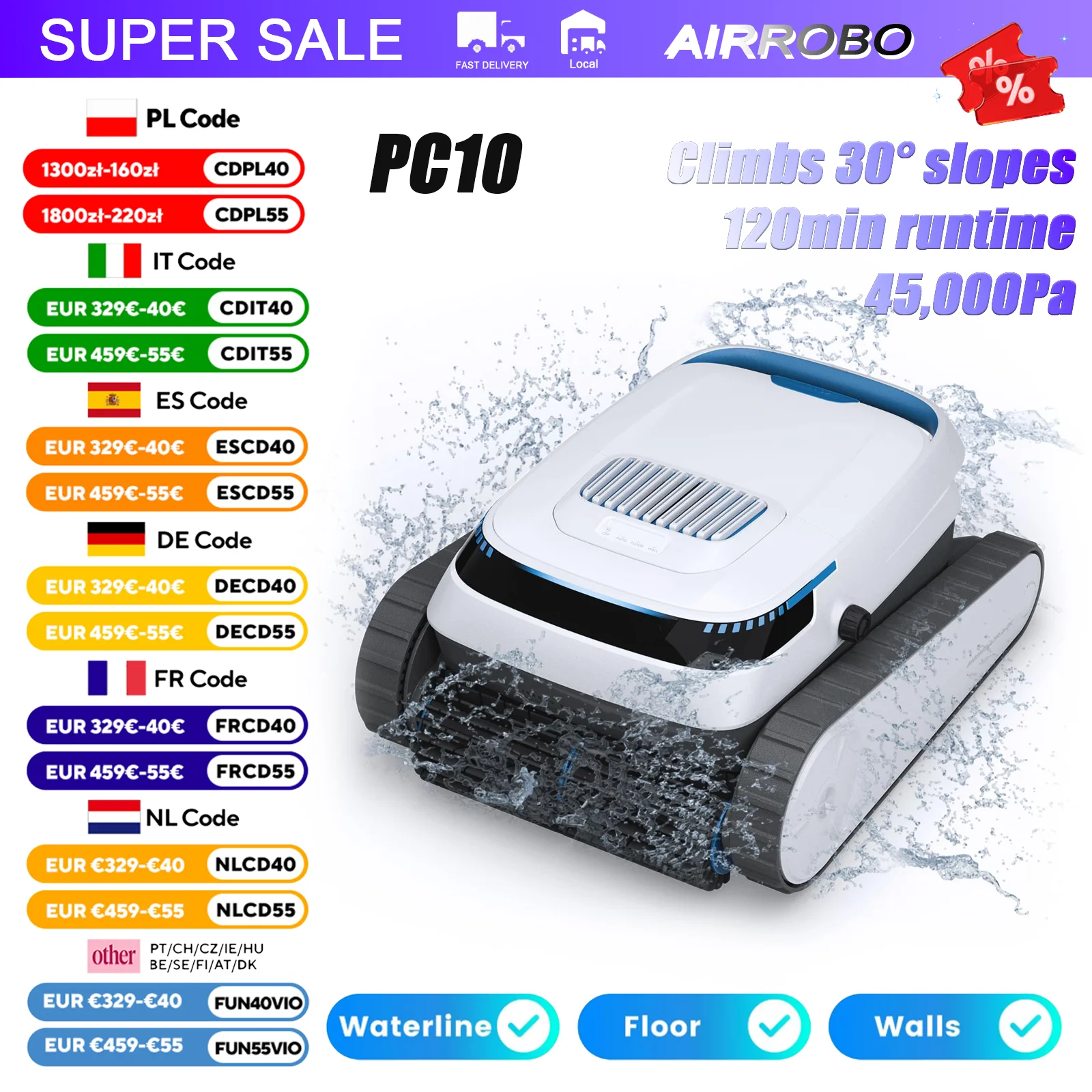 AIRROBO PC10 akumulátorové kaluž robotické čistič 45000pa silná sání chytrý navigace zeď horolezectví 3čepel úklid režimech 4L filtr 5200