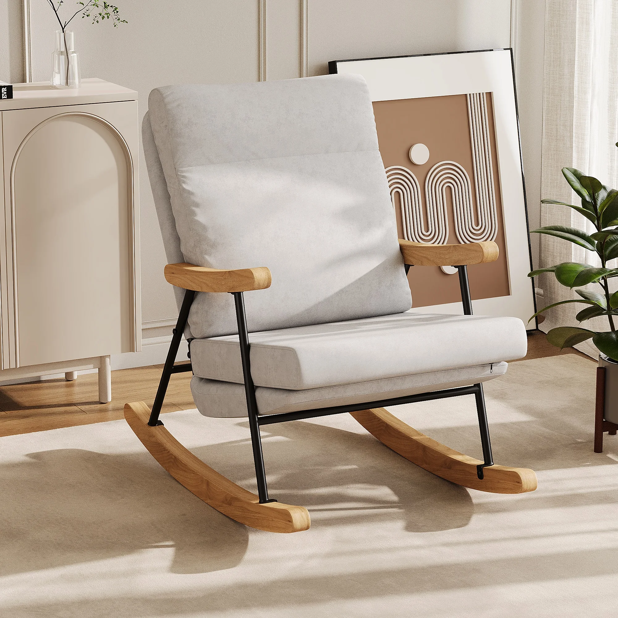 Rosahqnda houpací židle s dřevěný armrests a kov formulovat, kojící židle, moderní recliner židle, čalouněný Seat, lehký šedá prádlo