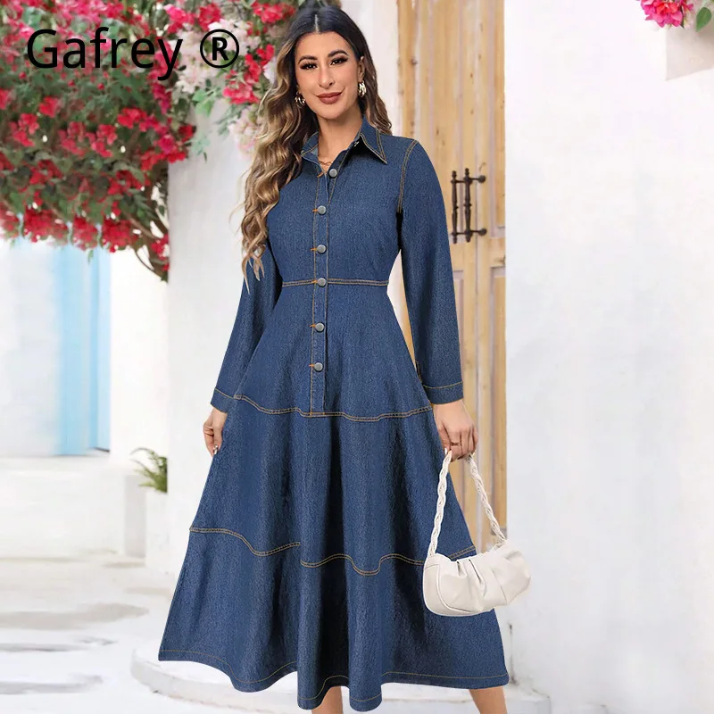 Klasický moderní elegantní ležérní temný modrá kolo krk knoflík přední placket krajka nahoře pás dámská dlouhé rukáv džínové šaty